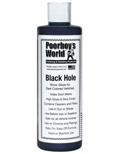 Poorboy’s Black Hole Glaze to niesamowita, łatwa w użyciu politura przeznaczona do ciemnych lakierów samochodowych, która delikatnie oczyszcza lakierowane powierzchnie i maskuje defekty. Pozostawia gładką, lustrzaną taflę lakieru i połysk godny najlepszego show samochodowego. Przygotowuje powierzchnię na zabezpieczenie powłoką ochronną w postaci sealantu lub wosku. Poorboy’s Black Hole Glaze jest mistrzem iluzji „mokrego lakieru”. Ukrywa powstające w skutek codziennego użytkowania ryski, tak widoczne na ciemnym lakierze. Produkt może być stosowany tak często, jak tylko potrzebujesz.