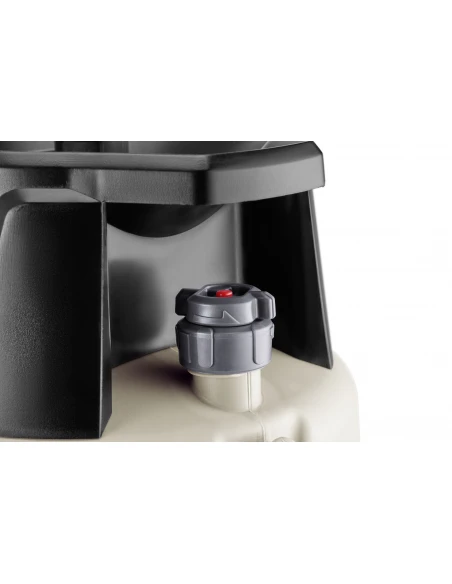 A sturdy plastic container with a slim silhouette and viewing strip ensures good control of the fill level. The PVC fabric hose, which is 1.80 m long, is oil-resistant and equipped with kink protection on the container. The quick-release valve with kink protection and locking function has an ergonomic operating lever with a locking option.