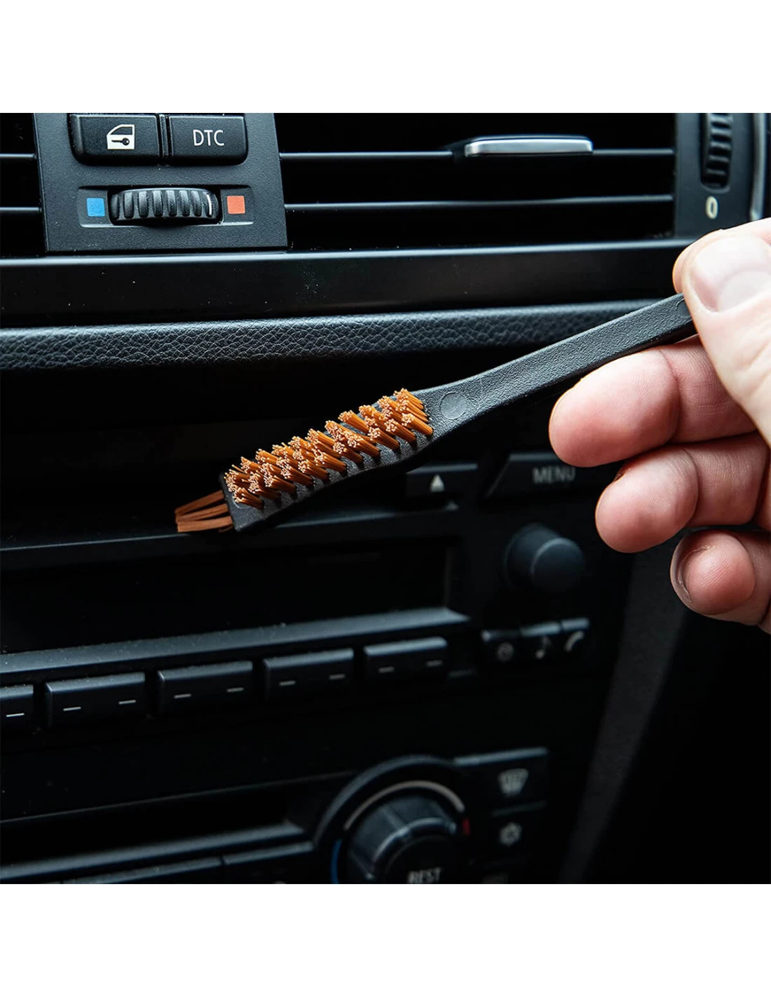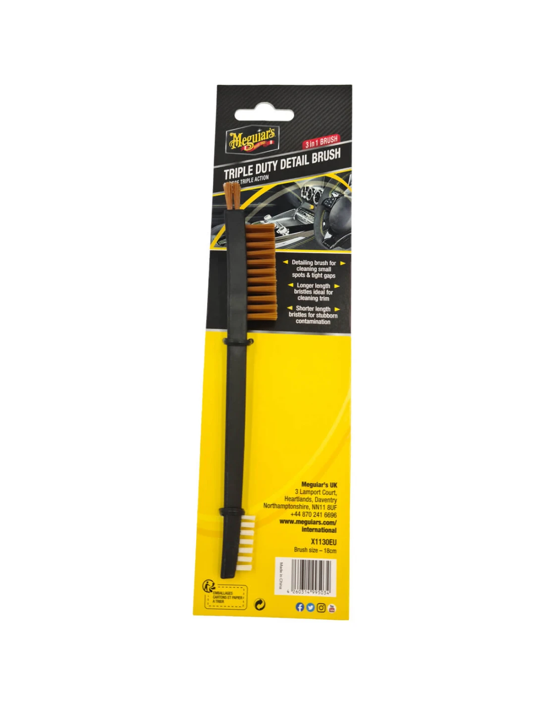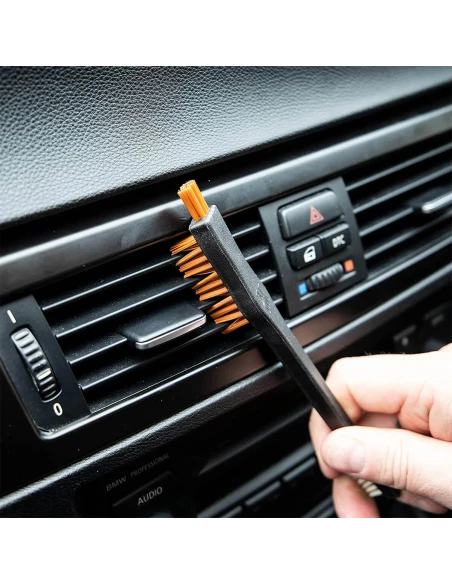 Meguiar's Triple Duty Detail Brush is a detail brush perfect for cleaning nooks and crannies and tight crevices. The longer bristles are ideal for cleaning small parts, while the shorter bristles easily remove stubborn dirt.