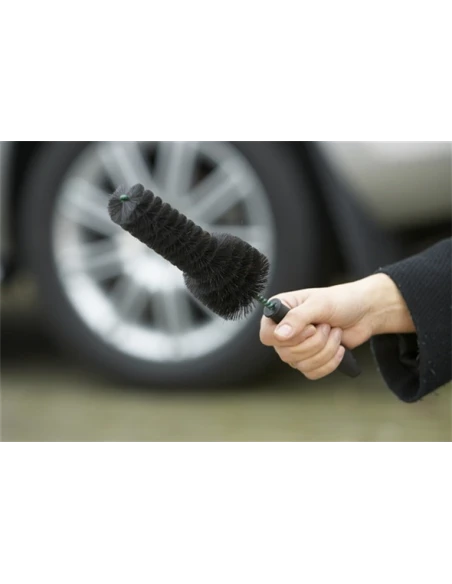 Clean hard-to-reach wheel rim surfaces with this chemical-resistant Rim Brush featuring soft natural filaments and a nylon-protected handle.