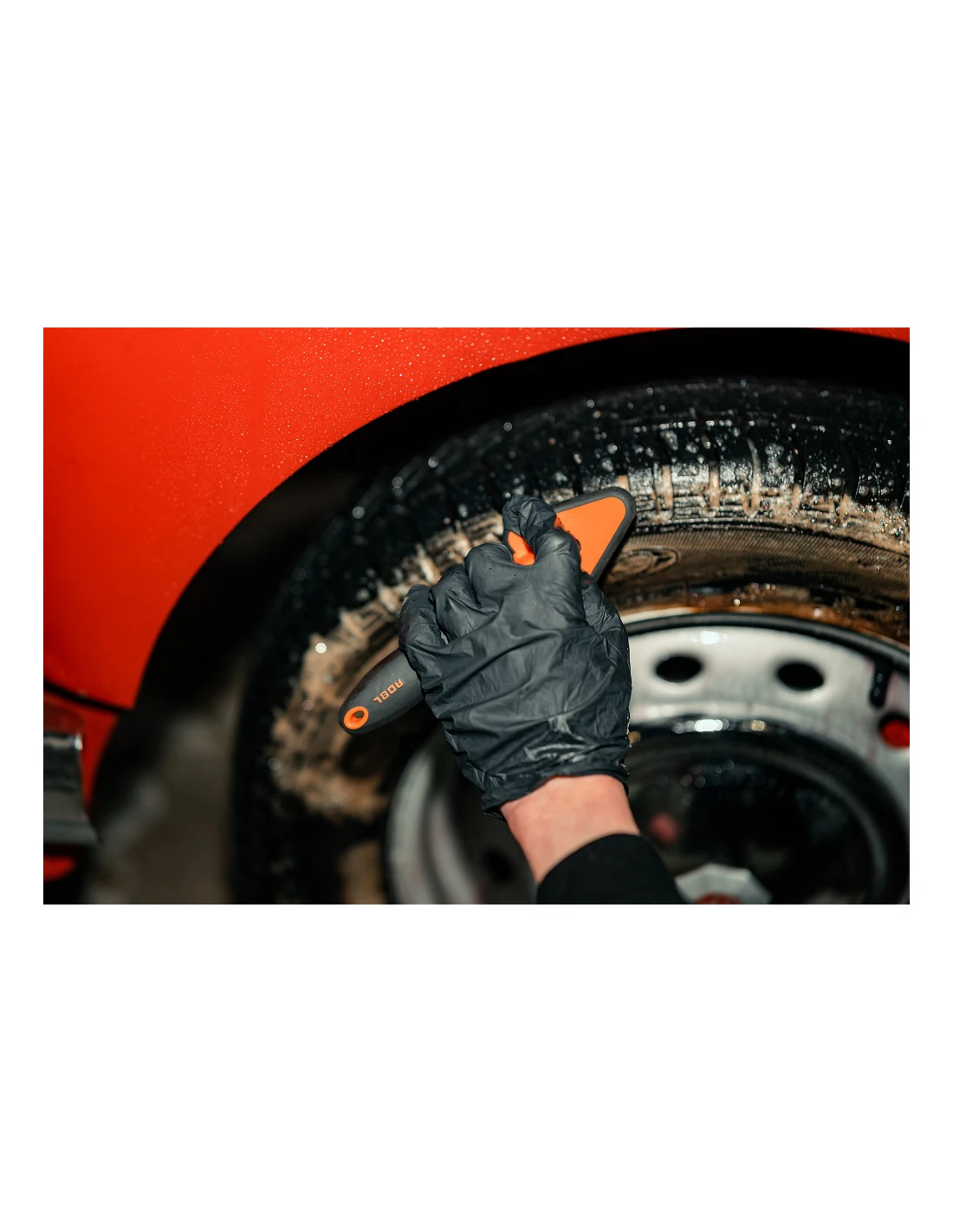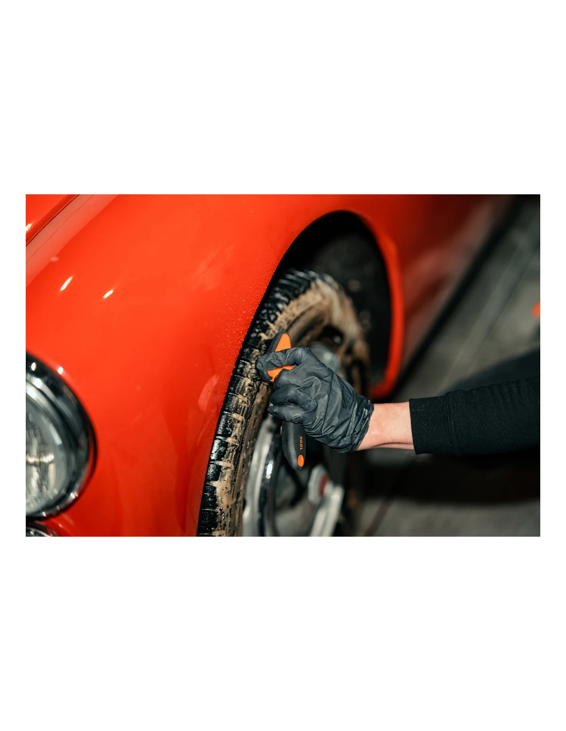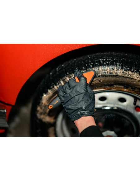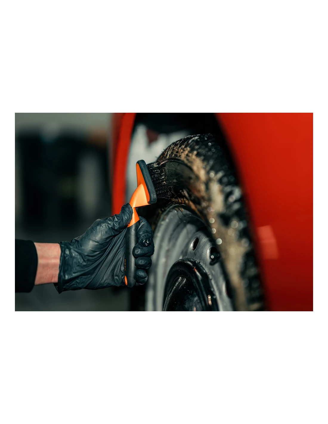 Brush for cleaning tyres of various tread types. The triangular shape and appropriately long-lasting bristles make it possible to reach and clean even hard-to-reach places effectively. Ergonomic grip, covered with a layer of non-slip rubber for comfortable use. Small size allows working with both high and low profile tyres.