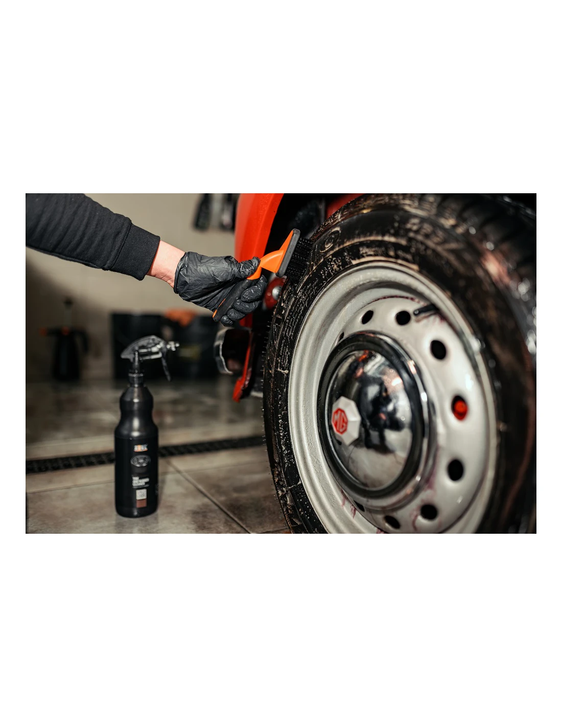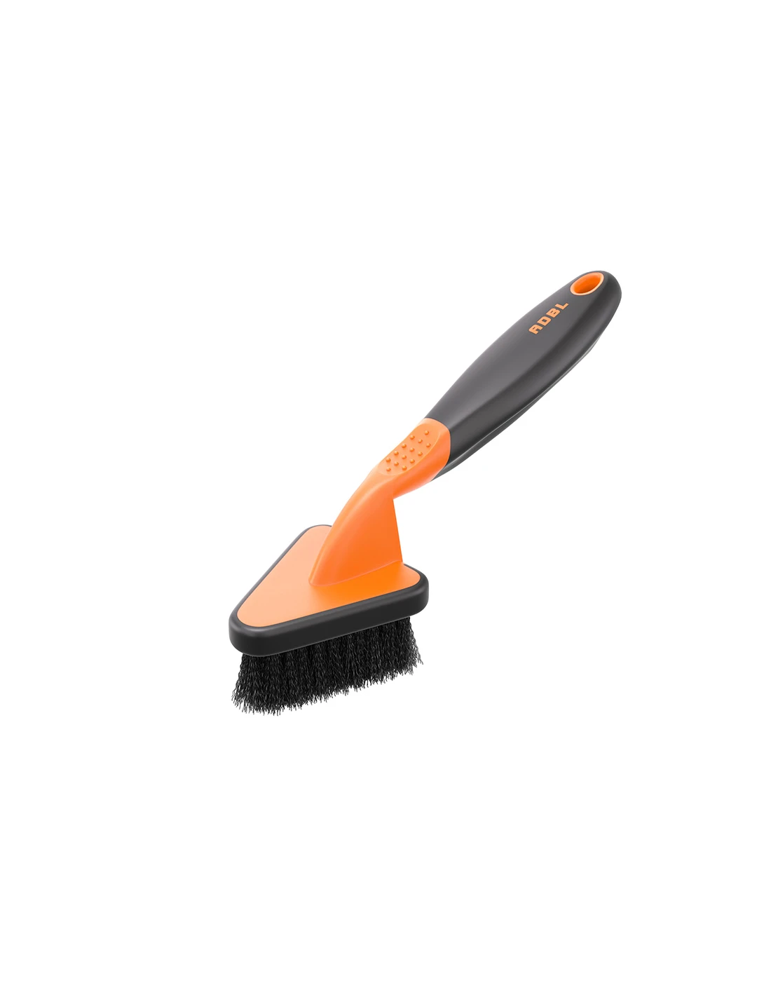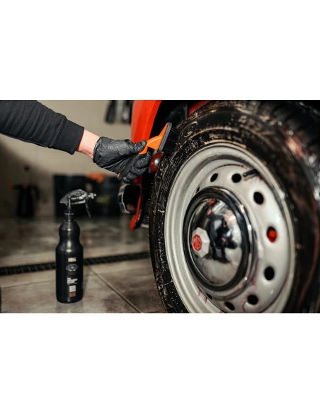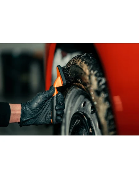 Brush for cleaning tyres of various tread types. The triangular shape and appropriately long-lasting bristles make it possible to reach and clean even hard-to-reach places effectively. Ergonomic grip, covered with a layer of non-slip rubber for comfortable use. Small size allows working with both high and low profile tyres.