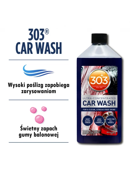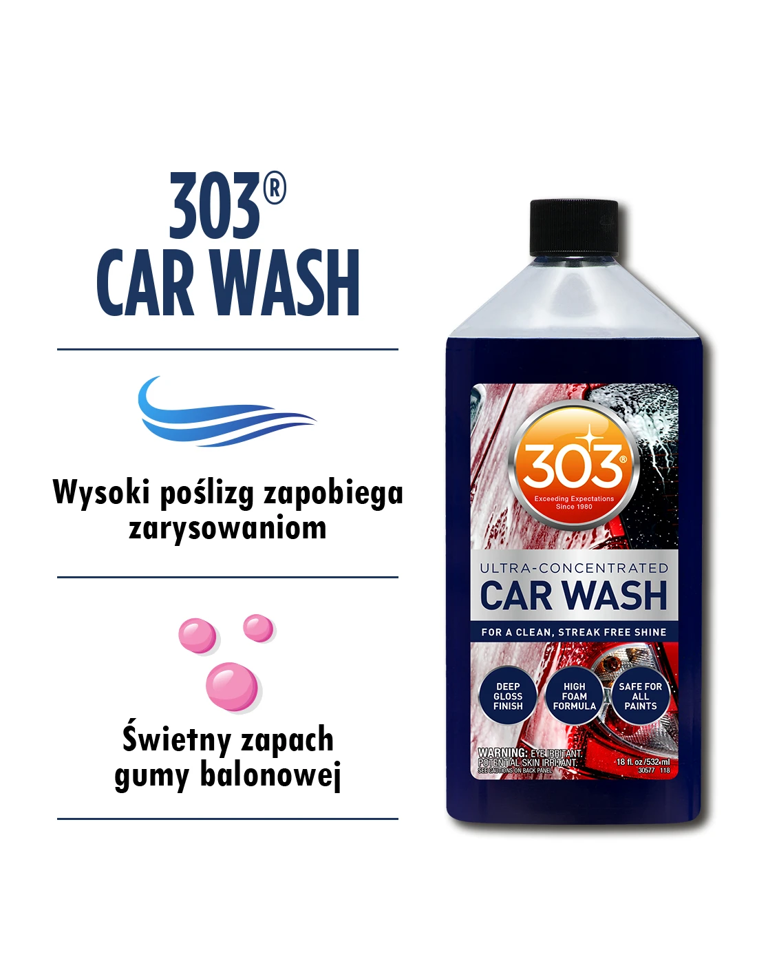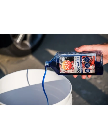 To use, make sure your vehicle is out of direct sunlight, and the surface is cool to the touch. This will ensure you do not get a streaky finish. Add 1 ounce of 303 Ultra Concentrated Car wash to a 5 gallon bucket, and fill the bucket with clean water. Wash vehicle with your preferred wash mitt, and then dry with a microfiber drying towel.