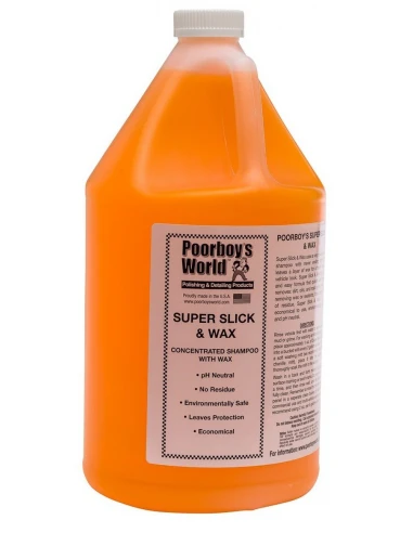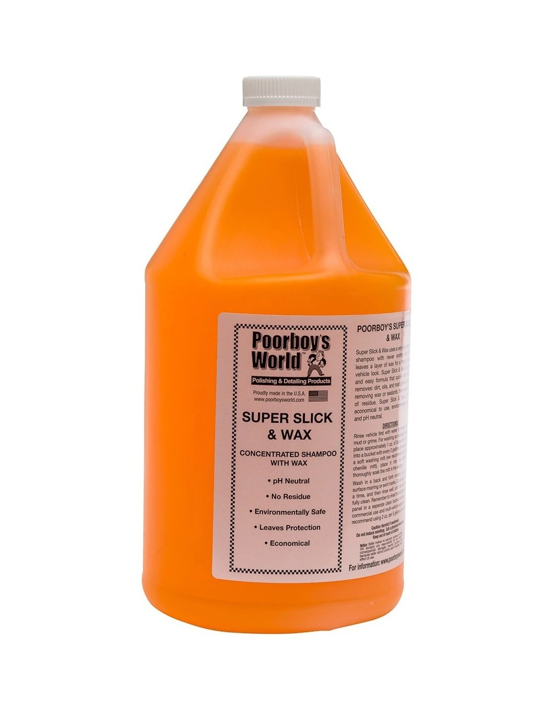Super Slick & Wax has lavish endless suds that contain lubricants and emulsifiers, that will gently wash the dirt and grime away. Super Slick & Wax was first introduced for those in colder climates where a small bit of protection would be added during washing, to help the protection on the vehicle last till spring. Super Slick & Wax can also be used in warm climates for those who want to extend the life their already applied last stage product (LSP). Super Slick & Wax also helps to prevent water spotting, especially in areas with hard water. A super concentrated formula allows you to use just 1 oz. per wash! Your dollar goes further with Poorboy's World Super Slick & Wax!