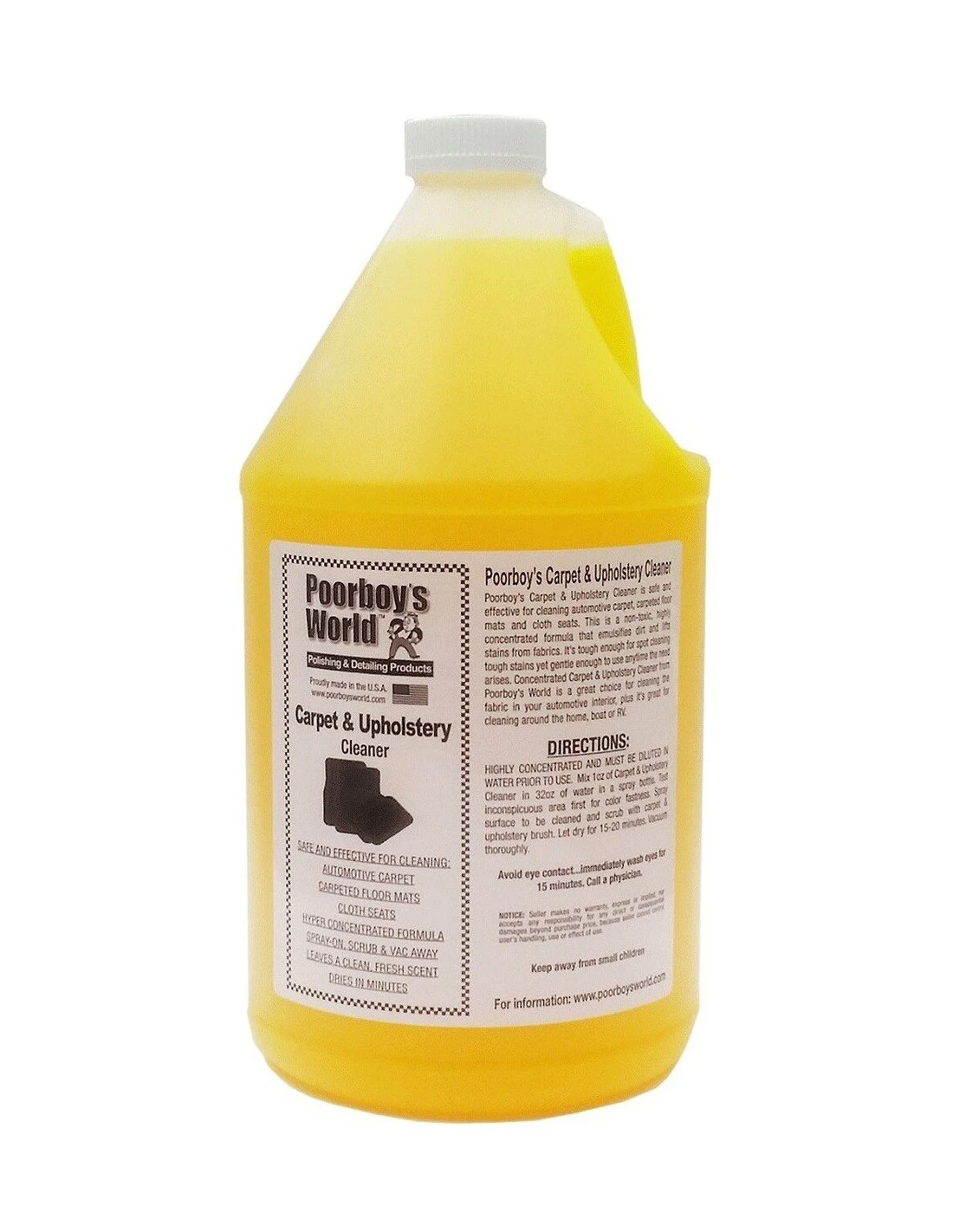 Poorboy’s World Carpet & Upholstery Cleaner is safe and effective for cleaning automotive carpet, carpeted floor mats and cloth seats. This is a non-toxic, highly concentrated formula that emulsifies dirt and lifts stains from fabrics. It’s tough enough for spot cleaning tough stains yet gentle enough to use anytime the need arises. Concentrated Carpet & Upholstery Cleaner from Poorboy’s World is a great choice for cleaning the fabric in your automotive interior, plus it’s great for cleaning around the home, boat or RV.