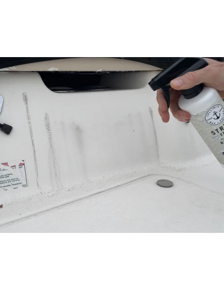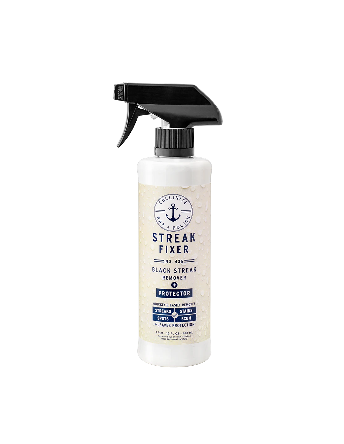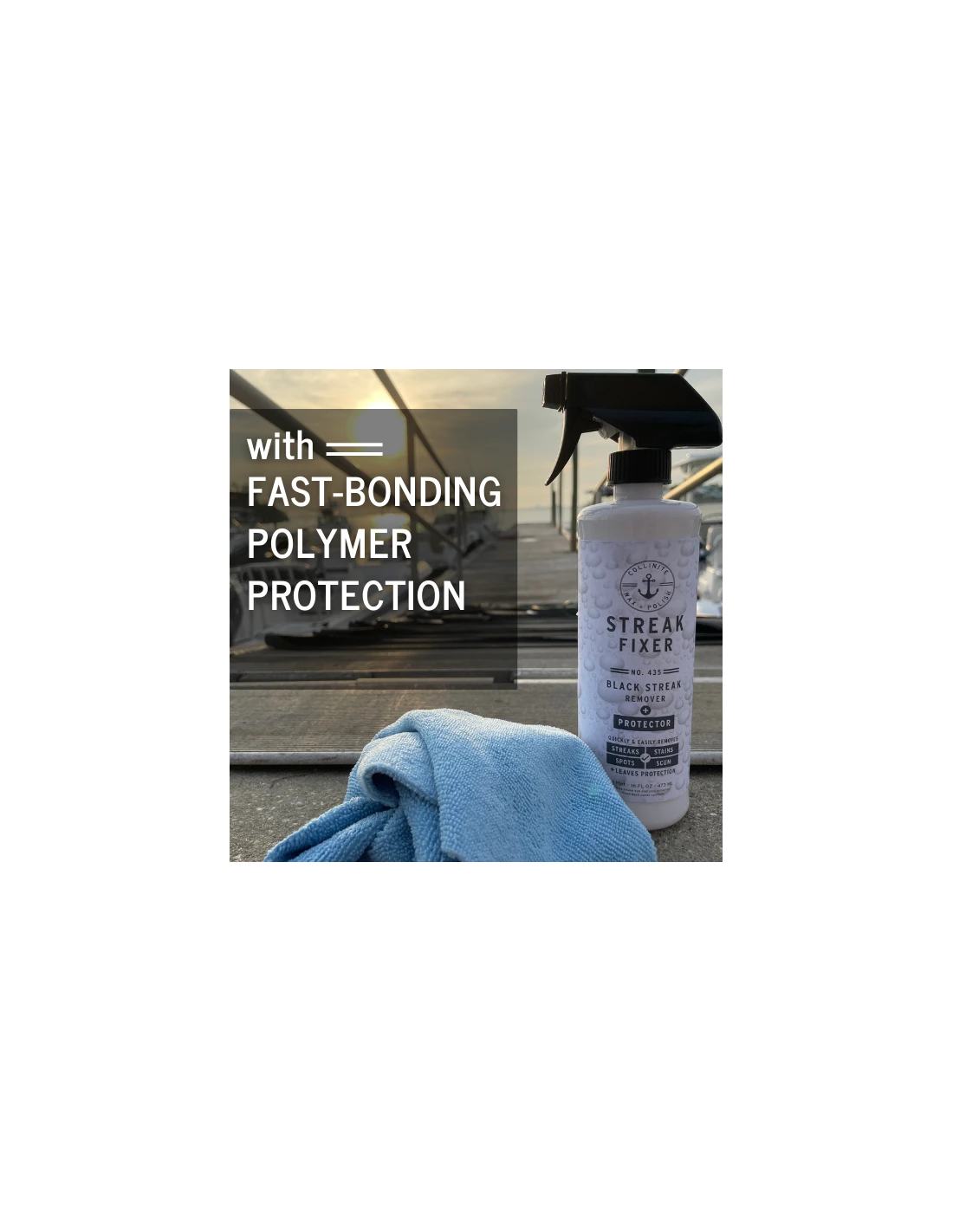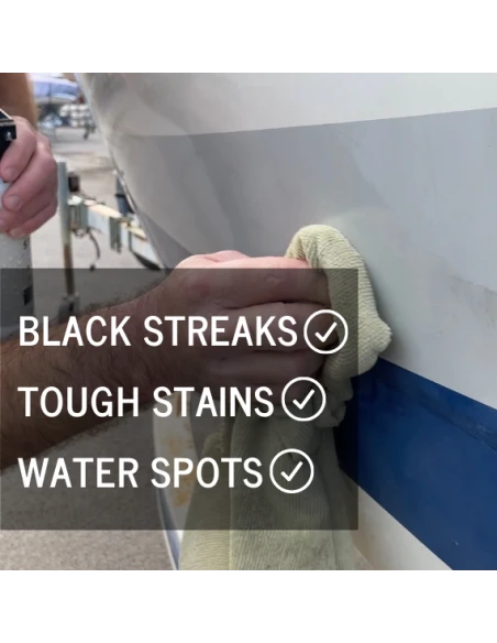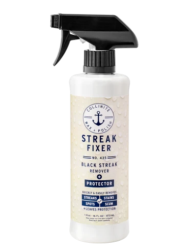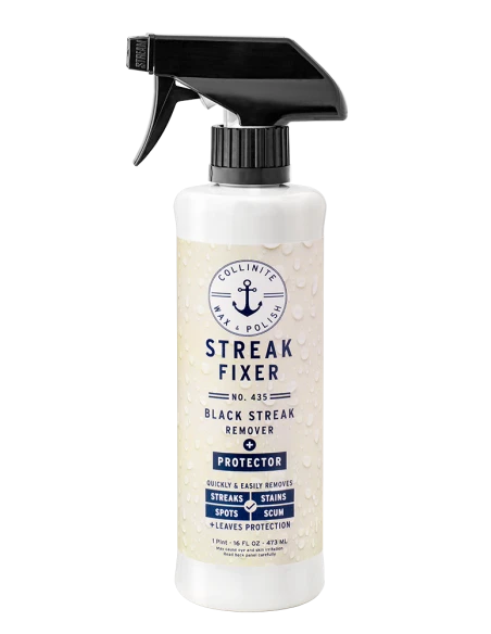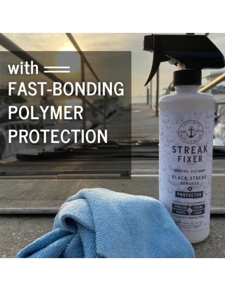 Your all new, on-deck all in one. Easy to use No. 435 Black Streak Remover + Protector safely and effectively eliminates black streaks, tough stains and fresh water spots from fiberglass surfaces. Quickly restores finish while leaving behind fast-bonding polymer surface protection. Safe for use on fiberglass, metal and painted surfaces. Not for glass or upholstery. Not designed for oxidation removal (where a compound or polish* would be better utilized) or heavily soiled surfaces requiring a pre-wash.