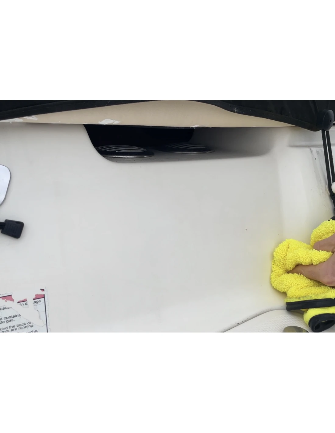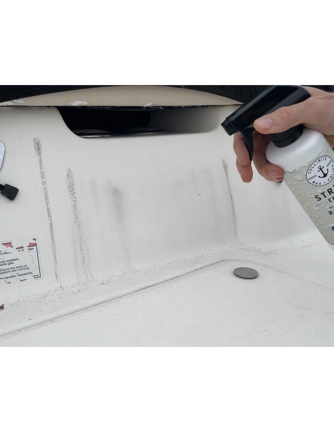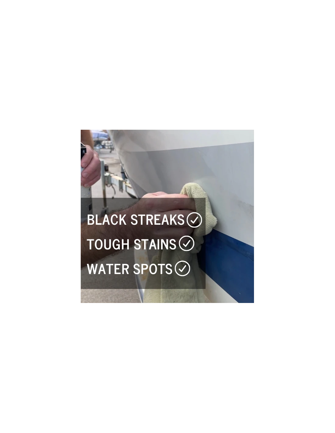 Your all new, on-deck all in one. Easy to use No. 435 Black Streak Remover + Protector safely and effectively eliminates black streaks, tough stains and fresh water spots from fiberglass surfaces. Quickly restores finish while leaving behind fast-bonding polymer surface protection. Safe for use on fiberglass, metal and painted surfaces. Not for glass or upholstery. Not designed for oxidation removal (where a compound or polish* would be better utilized) or heavily soiled surfaces requiring a pre-wash.