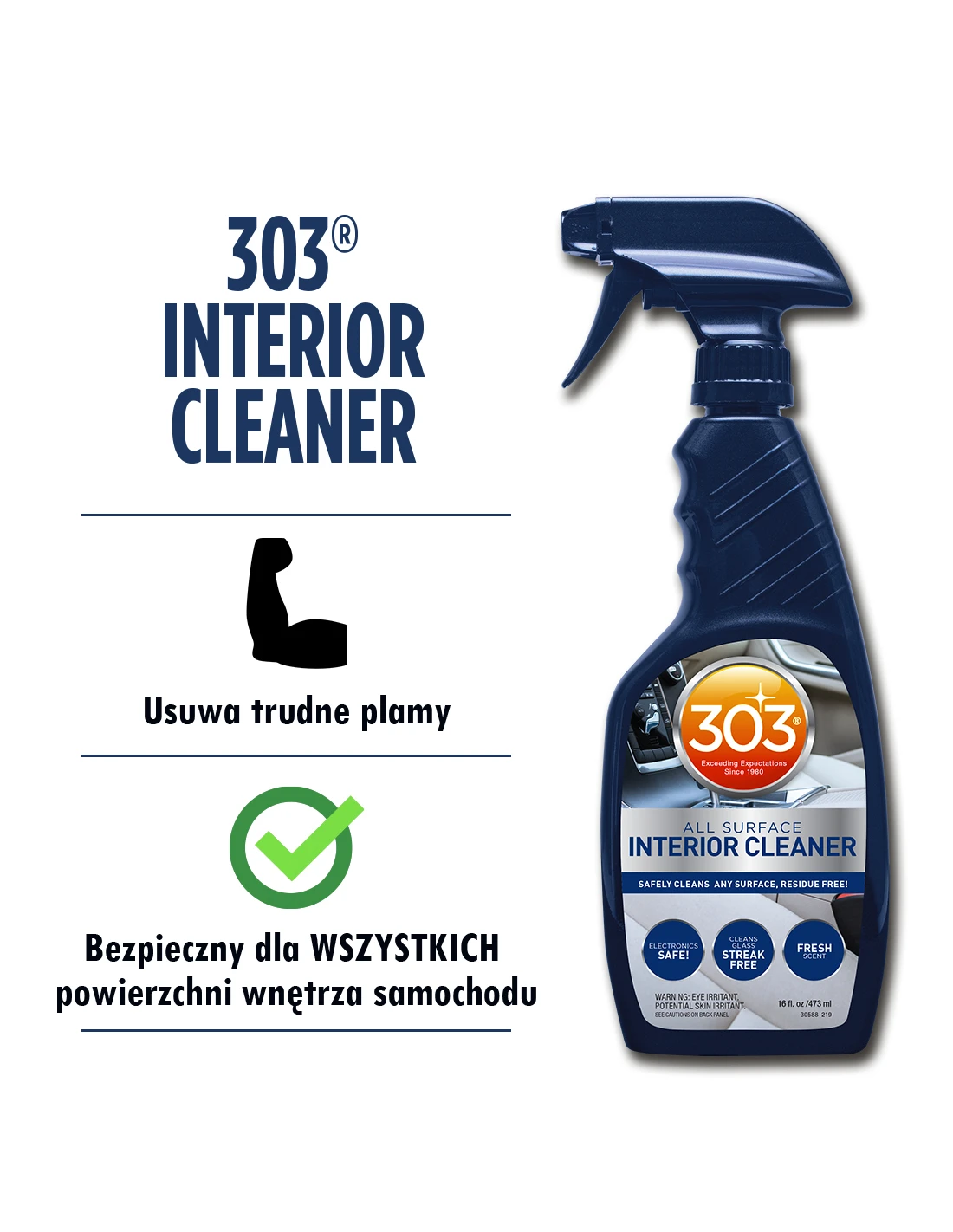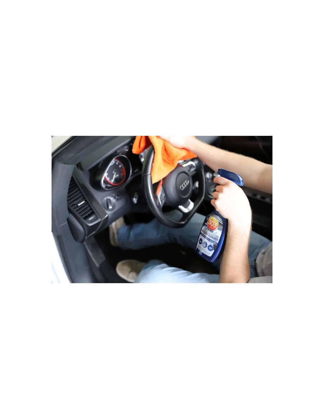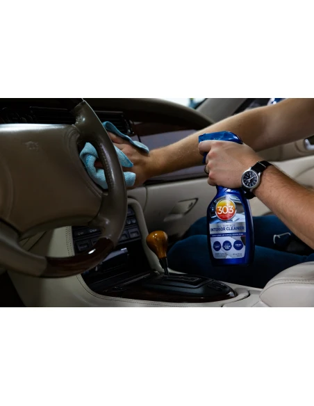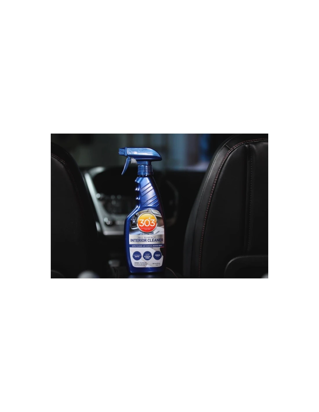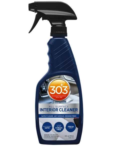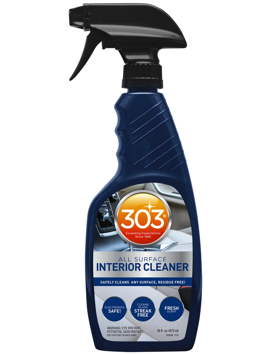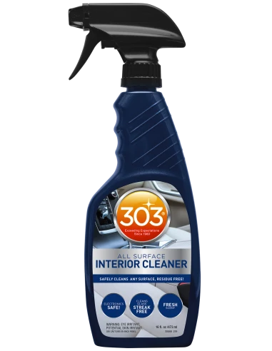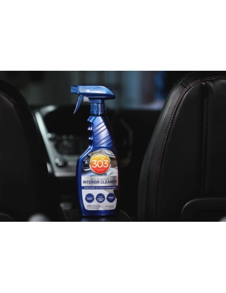 303 Interior Cleaner is a great cleaner for all of the interior surfaces of your vehicle. It is gentle and safe, but still has the strength to clean away tough stains. It lifts dirt from the surface when sprayed on, and wipes off residue free. This formula also helps repel dust and dirt, and leaves a clean natural appearance on the surface after using. 303 Interior Cleaner is safe and effective on: vinyl, plastic, rubber, leather, fabrics/upholstery, carpets, glass, and even LCD screens.
