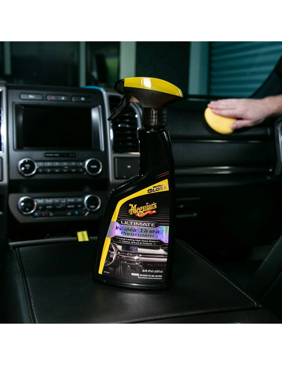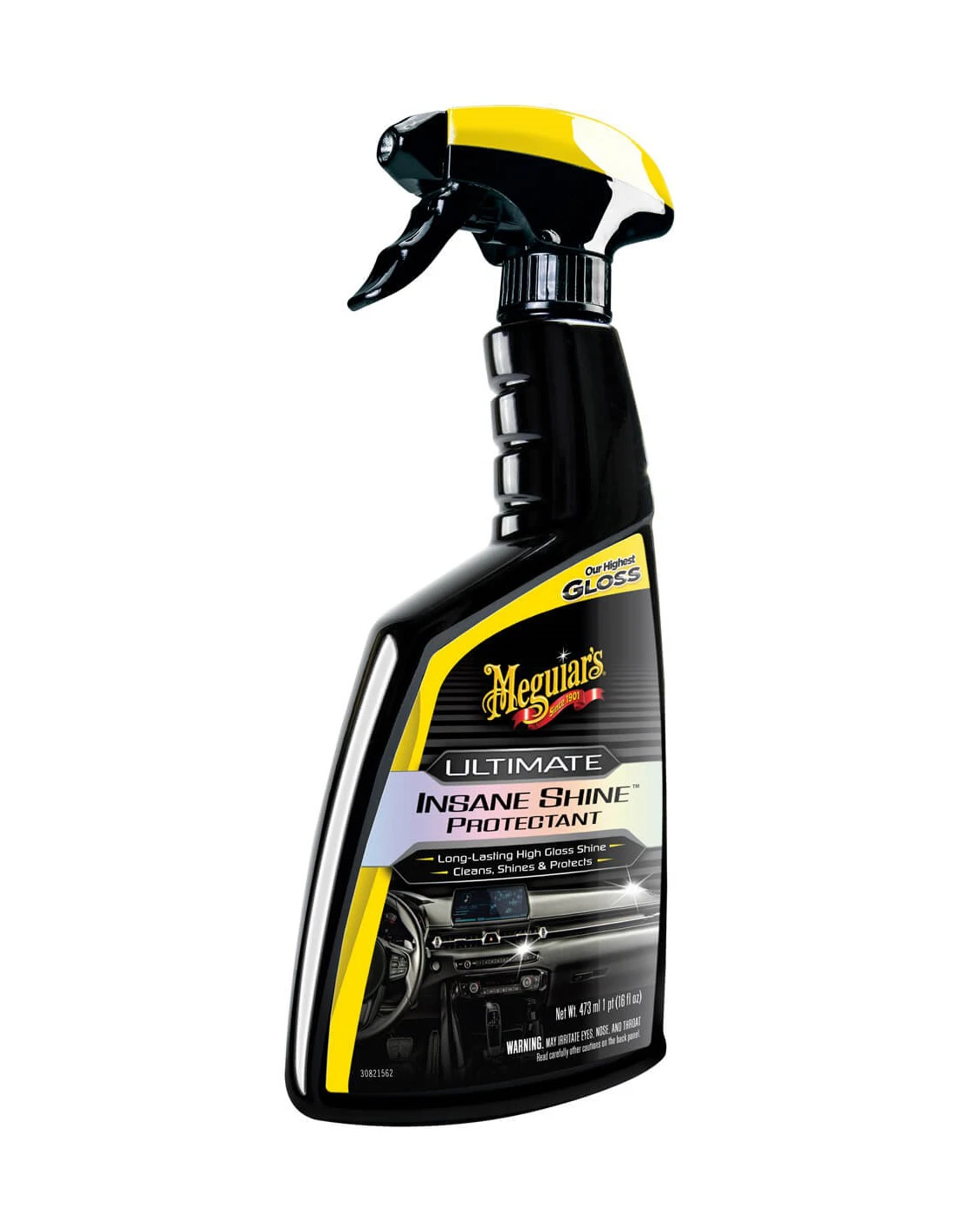 Meguiar's Ultimate Insane Shine Protectant creates a rich, dark, and durable high gloss finish on unpainted vinyl, plastic, and rubber surfaces. This premium protectant spreads easily without streaking and creates a dark, high-gloss shine that improves the appearance of surfaces like dashboards, door panels, consoles, tires, wheel wells, and exterior trim. Ultimate Insane Shine Protectant is also available in a wipe.
