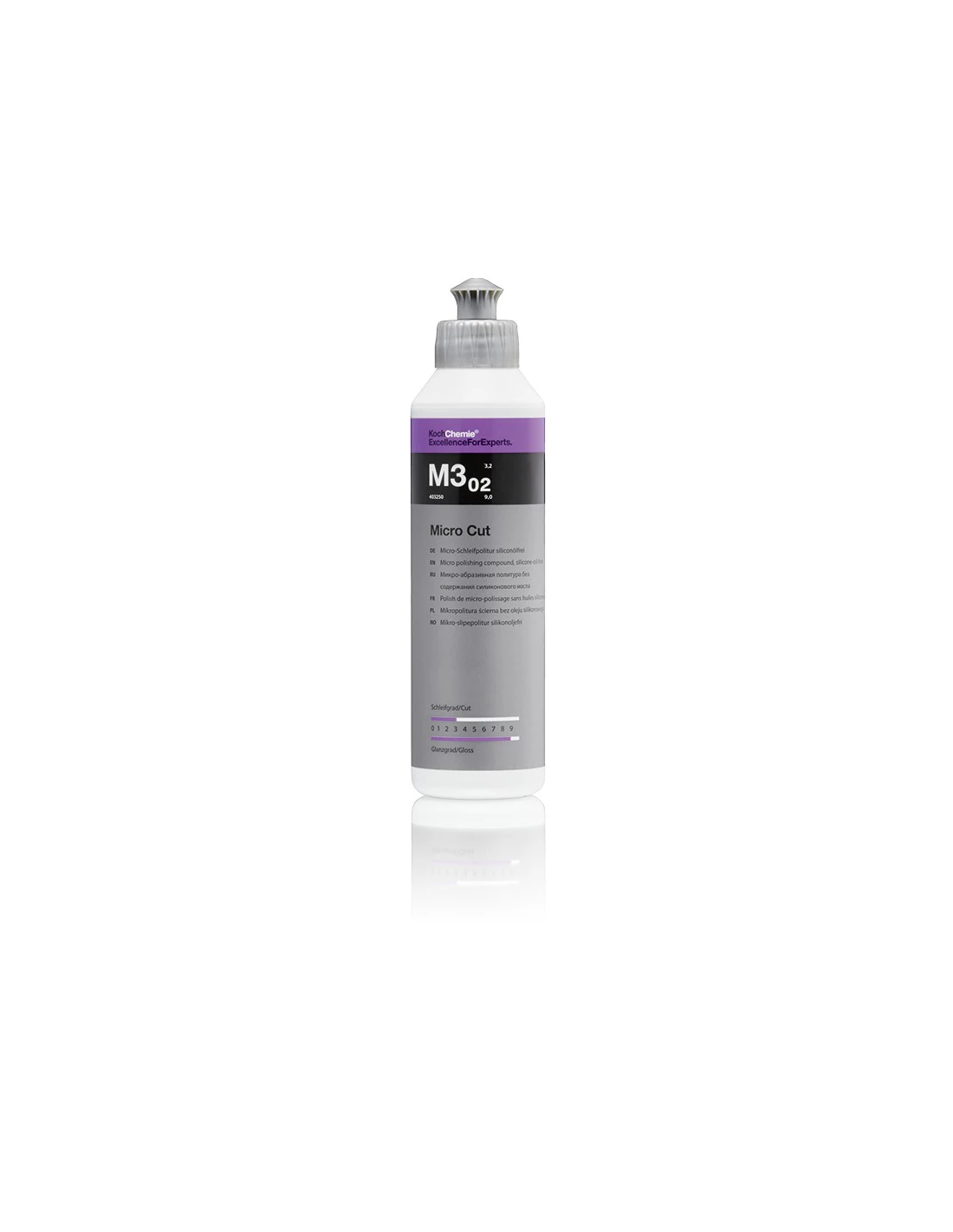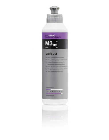 Micro Cut M3.02 is the latest generation machine micro-polish for the permanent removal of streaks, holograms, fine scratches, and sanding marks to P3000 grain size on all paint systems (including scratch-resistant). Through the use of highly specialised, extremely homogenous abrasive bodies, a brilliant permanent high gloss finish is created under extreme light conditions even on dark and similarly sensitive shades. Holograms and fine scratches are eliminated mechanically and not, which is often the case, covered over. Micro Cut M3.02 is extremely economical, easy to polish, and removable without leaving traces.
