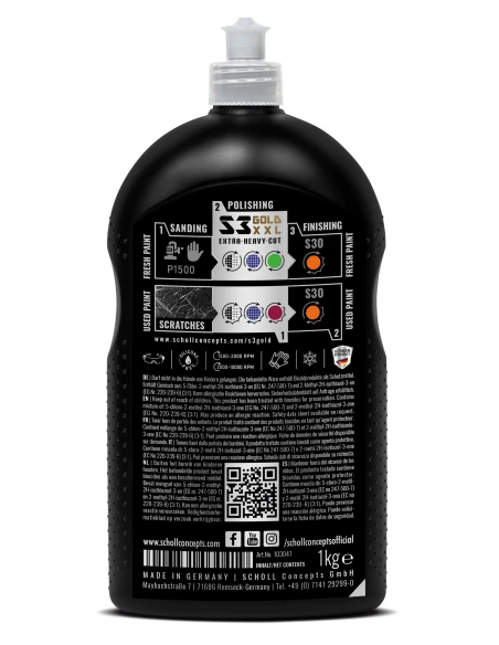 The High Performance Cutting Compound S3 Gold has been designed specifically for paint finishing work on scratch resistant surfaces including UV cured paints. Thanks to the unique iPT technology (intelligent Powder Technology) which is based on high-purity aluminum oxide, you can now remove imperfections in the top coat even quicker and easier. The outstanding cut, the brilliant mirror-like gloss, and the easy handling of the High Performance Compound will convince you.