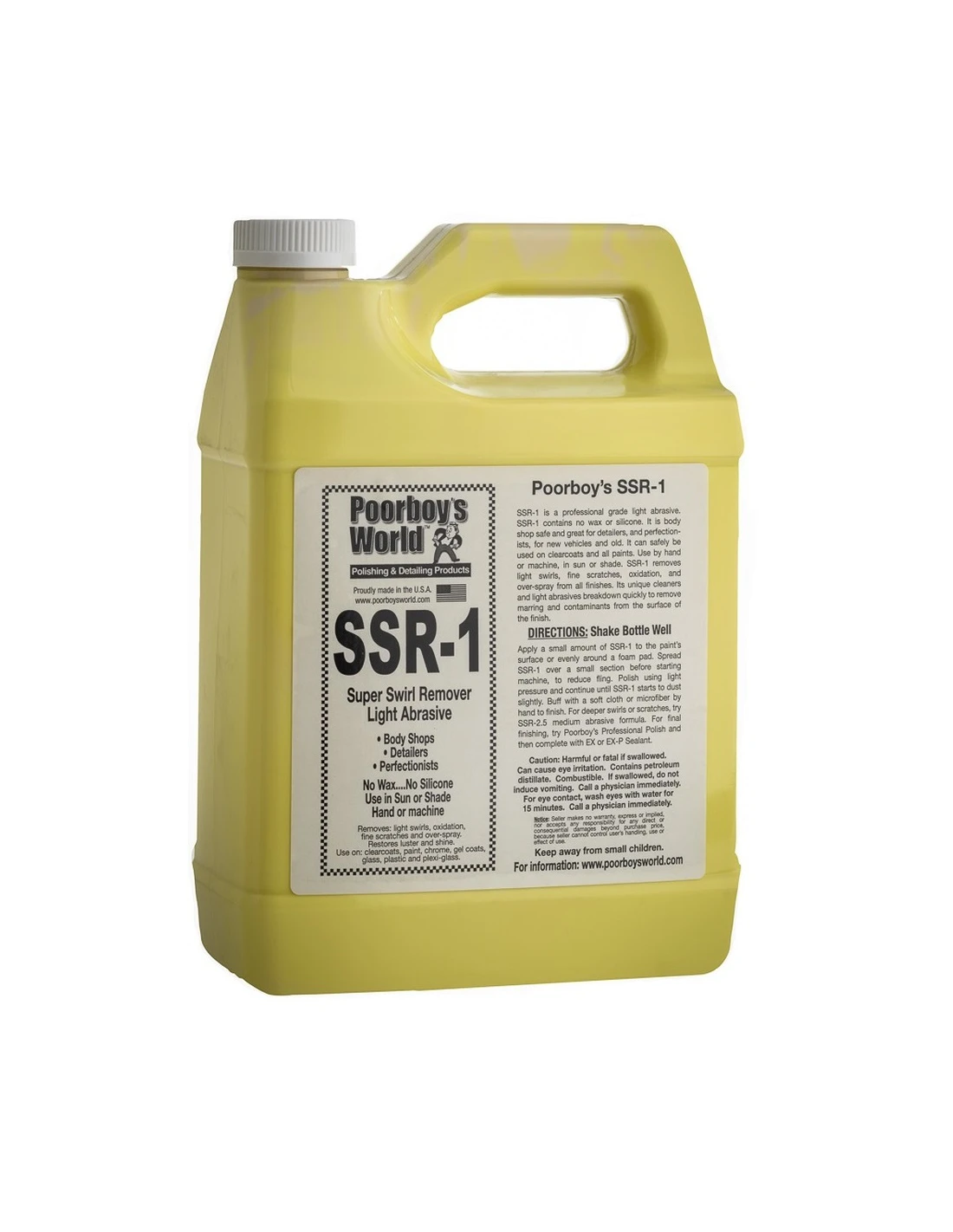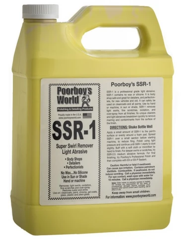 Poorboy's World SSR-1 Super Swirl Remover is the lightest in our line of Super Swirl Removers. This light abrasive is for removal of light swirls, oxidation, fine scratches, final polish/jeweling, and light over-spray. SSR-1 restores luster and shine to your finish. SSR-1 is "Body Shop Safe" and does not contain wax, silicone, or gloss enhancers, what you see is what you get, there is never a need for a time consuming IPA wipe down to see what you have removed.