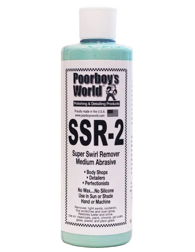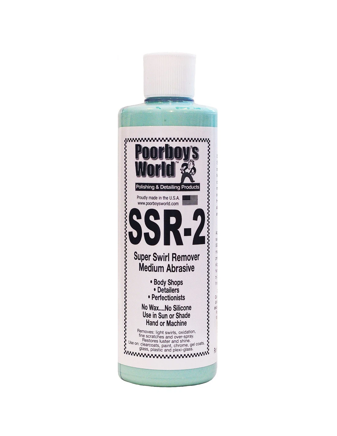 Poorboy's World SSR-2 Super Swirl Remover is the second lightest in our line of Super Swirl Removers. This medium abrasive is for removal of light to moderate swirls, oxidation, fine to moderate scratches, final polishing, and light to moderate over-spray. SSR-2 restores luster and shine to your finish. SSR-2 is "Body Shop Safe" and does not contain wax, silicone, or gloss enhancers, what you see is what you get, there is never a need for a time consuming IPA wipe down to see what you have removed. Just like all Poorboy's World products SSR-2 may be used in the SUN or SHADE. SSR-2 may be used by HAND or MACHINE. For use on Clear-coats, Paint, Chrome, Gel Coats, Glass, and Plexiglas. Recommended machine buffing pads are: Finishing and Polishing.