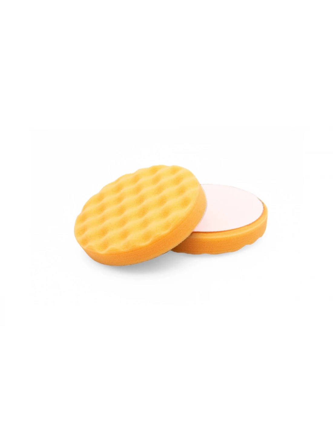 Orange reticulated foam with waffle surface that helps to keep surface cool during polishing, and allows the foam to hold more compound whilst reducing the risk of splashing.