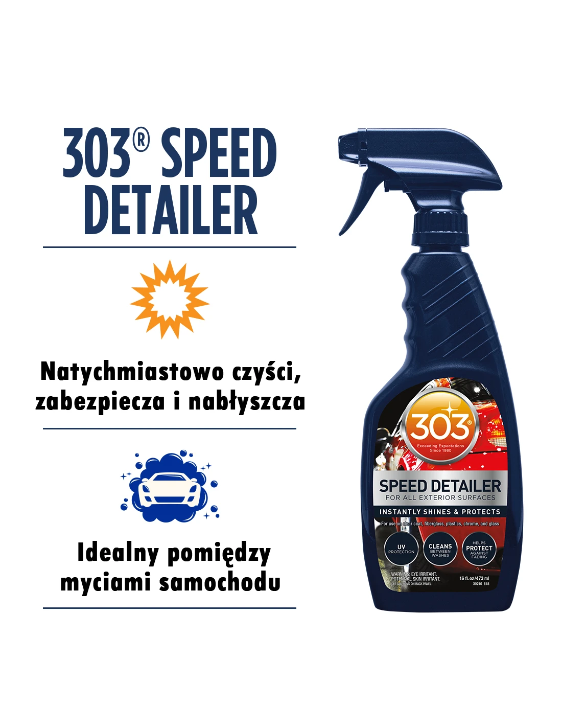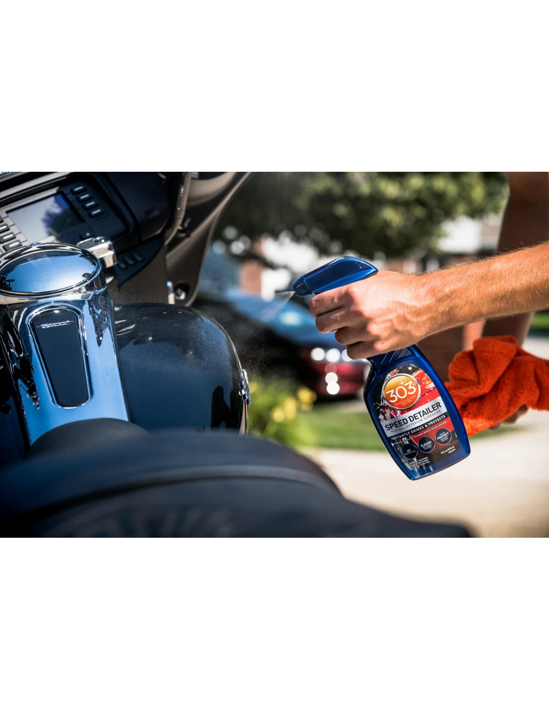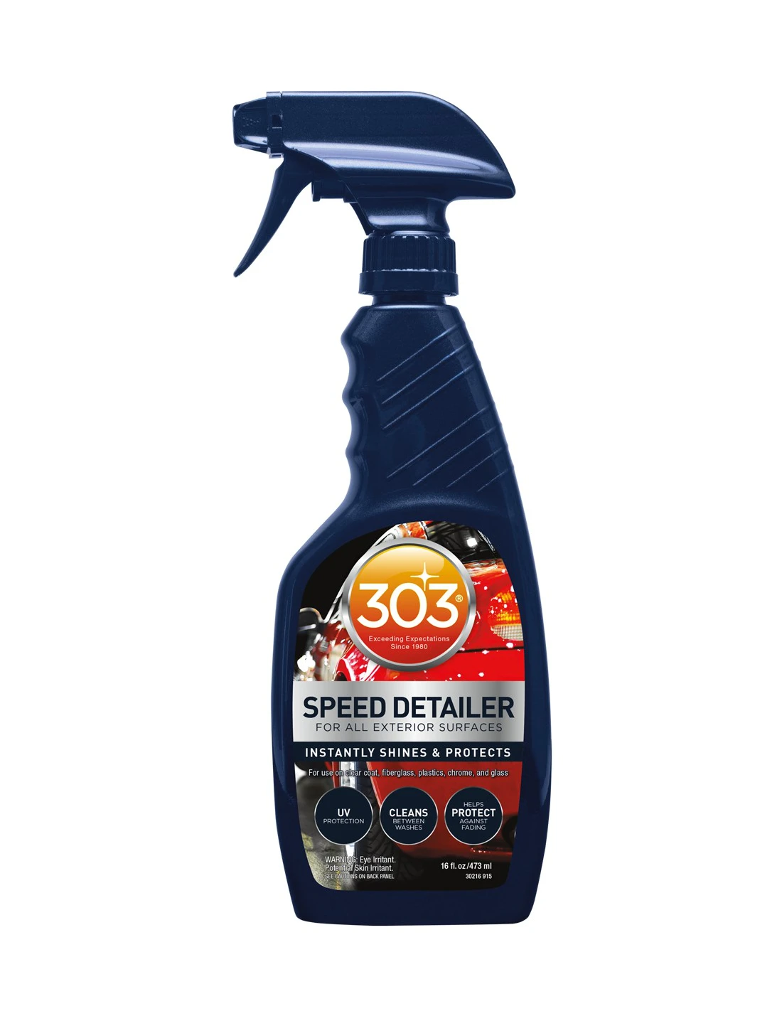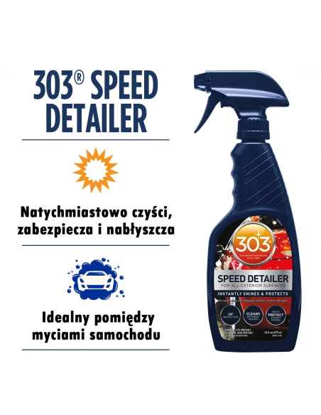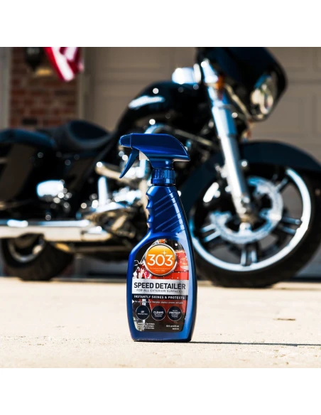 303® Automotive Speed Detailer is a premium formula designed to instantly clean, protect and produce a high-gloss finish on surfaces. It cleans, protects and shines paint, plastics, fiberglass, gel-coat, aluminum, chrome, stainless steel, and even glass. Quick and easy to use, simply mist on and wipe off. Anti-static, repels dust, dirt and stains and helps protect against light surface scratches.
