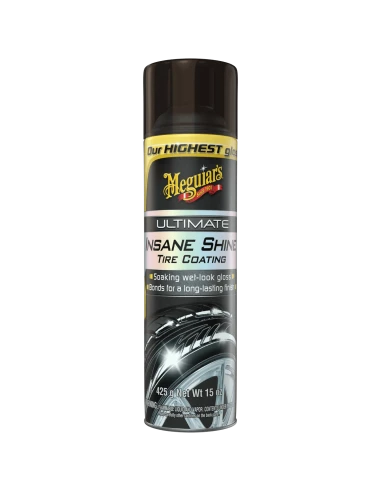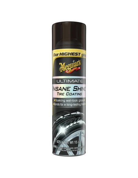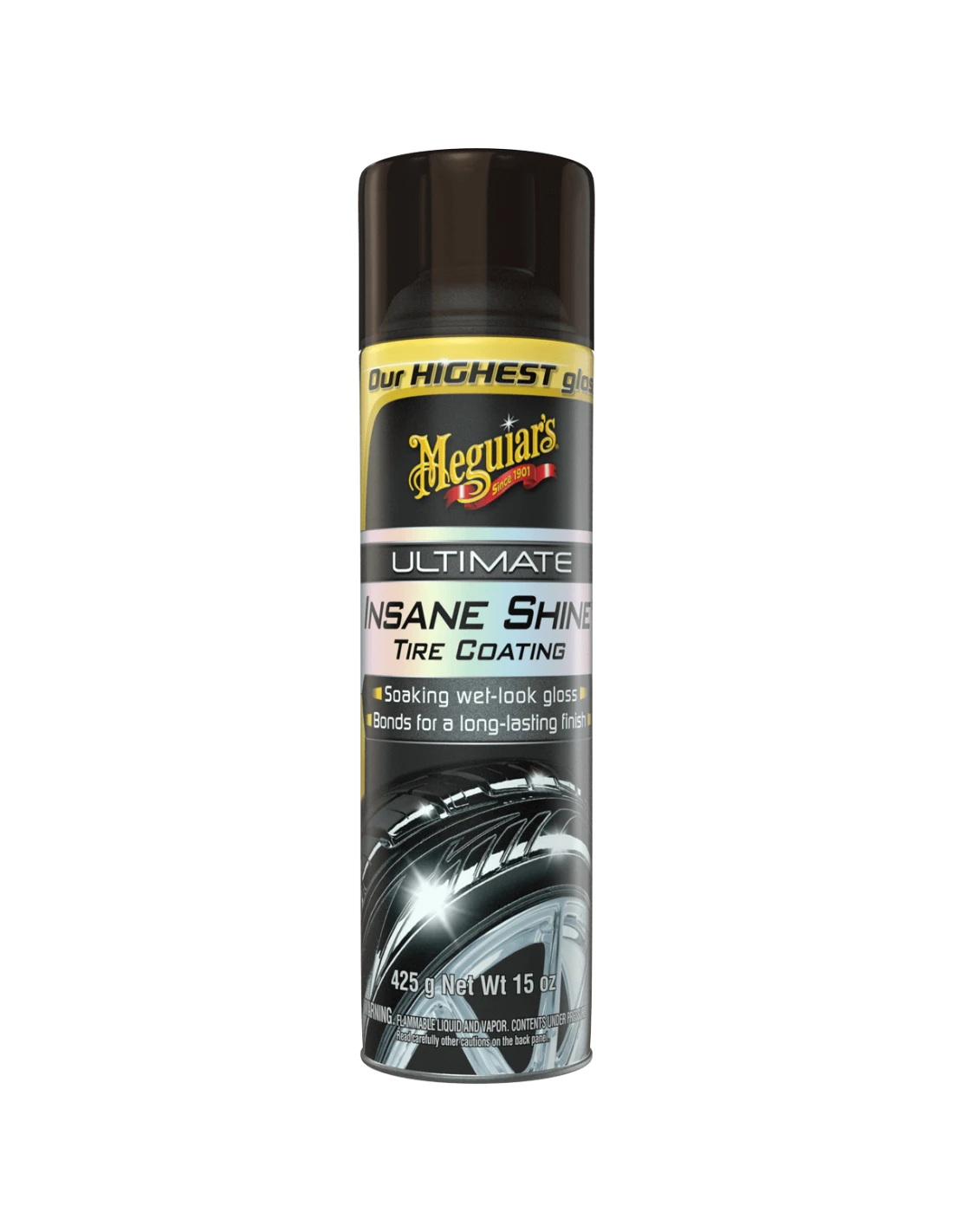 Meguiar's Ultimate Insane Shine Tire Coating is the highest gloss tire shine Meguiar's has to offer. With advanced synthetic polymer chemistry, this premium aerosol tire shine delivers extreme, attention-grabbing depth with amazing shine and gloss. You won't believe your eyes as tires will appear like they are actually wet! Our exclusive formula also contains enhanced resin technology producing an amazing bond for a long-lasting finish. Anti-ozonants protect tires against cracking and fading over time while the self-spreading formula is easy to work with reducing streaks and runs. So, if you are looking for a tire coating that offers protection, is easy to use and with a shine that looks like it's soaking wet, Meguiar's Ultimate Insane Shine Tire Coating is for you.