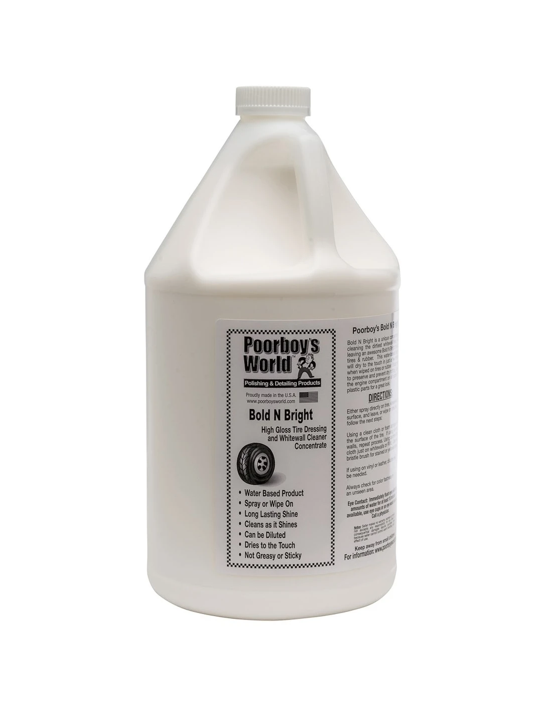 Poorboy's World Bold N Bright is a water based tire dressing, containing no petroleum distillates, and will actually help to condition your tire and protect it from the harmful rays of the sun with UVA and UVB blockers. A water based tire dressing is a must if you want to keep your tires in the best condition possible. In fact most manufacturers will void your warranty if tire dressings containing petroleum distillates are used on your tire! The reason for this is they can seep into the tire and breakdown the rubber, possibly causing a blow out.
