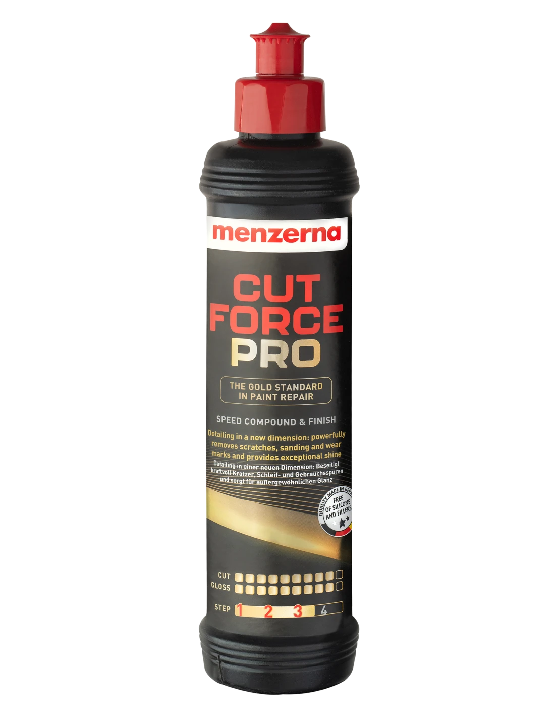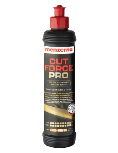 Menzerna Cut Force Pro - pasta polerska typu One Step Polish o innowacyjnej technologii, zapewniającej niespotykaną wcześniej moc polerską przy równoczesnym zachowaniu doskonałego połysku. Skutecznie usuwa zarysowania, ślady szlifowania i defekty lakieru. Menzerna Cut Force Pro wynosi polerowanie lakieru samochodowego na zupełnie nowy poziom.