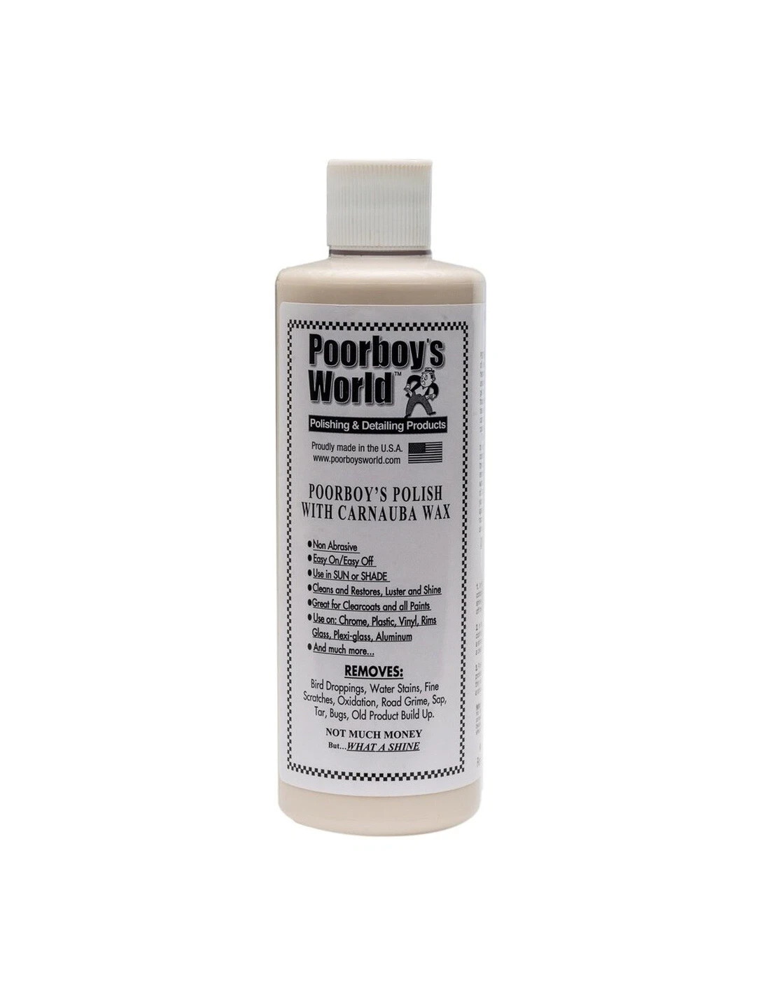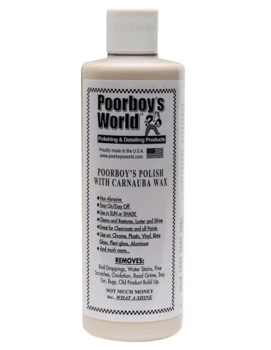 POORBOY’S Polish w/ Carnauba to produkt typu AIO( All In One) . Za pomocą jednej łatwej aplikacji oczyszcza lakier oraz zabezpiecza go. Nie zawiera ścierniwa, oczyszcza skutecznie lakier bazując na chemicznych właściwościach czyszczących. Dzięki zawartości naturalnego wosku Carnauba zapewnia ochronę oraz głębię koloru i połysk. Idealny wybór dla osób nie mogących poświęcić dużej ilości czasu na przeprowadzenie złożonego procesu pielęgnacji lakieru kilkoma różnymi środkami. Krótko zwięźle i na temat, za jednym zamachem zapewnia doskonałą prezencję samochodu.