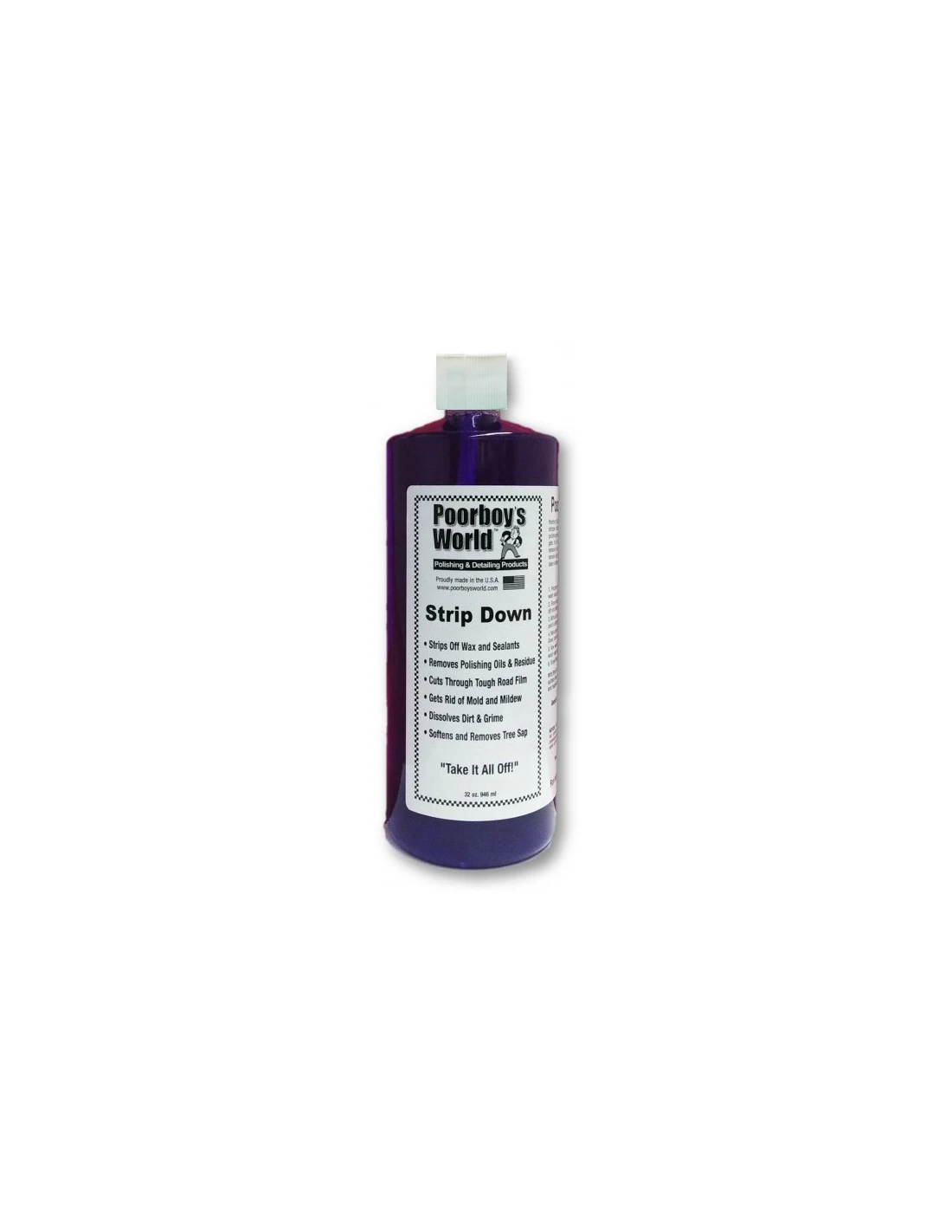 Poorboy's World Strip Down to wyjątkowo wydajny i bezpieczny preparat przeznaczony do głębokiego oczyszczania lakieru samochodowego. Z łatwością usuwa pozostałości po aplikowanych uprzednio woskach i sealantach. Usuwa resztki olejków z past polerskich. Idealny przy dekontaminacji i doczyszczaniu długo nie używanych pojazdów - sprawdza się w walce z grzybami i pleśnią. Rozpuszcza brud uliczny, zmiękcza i zmywa soki z drzew.