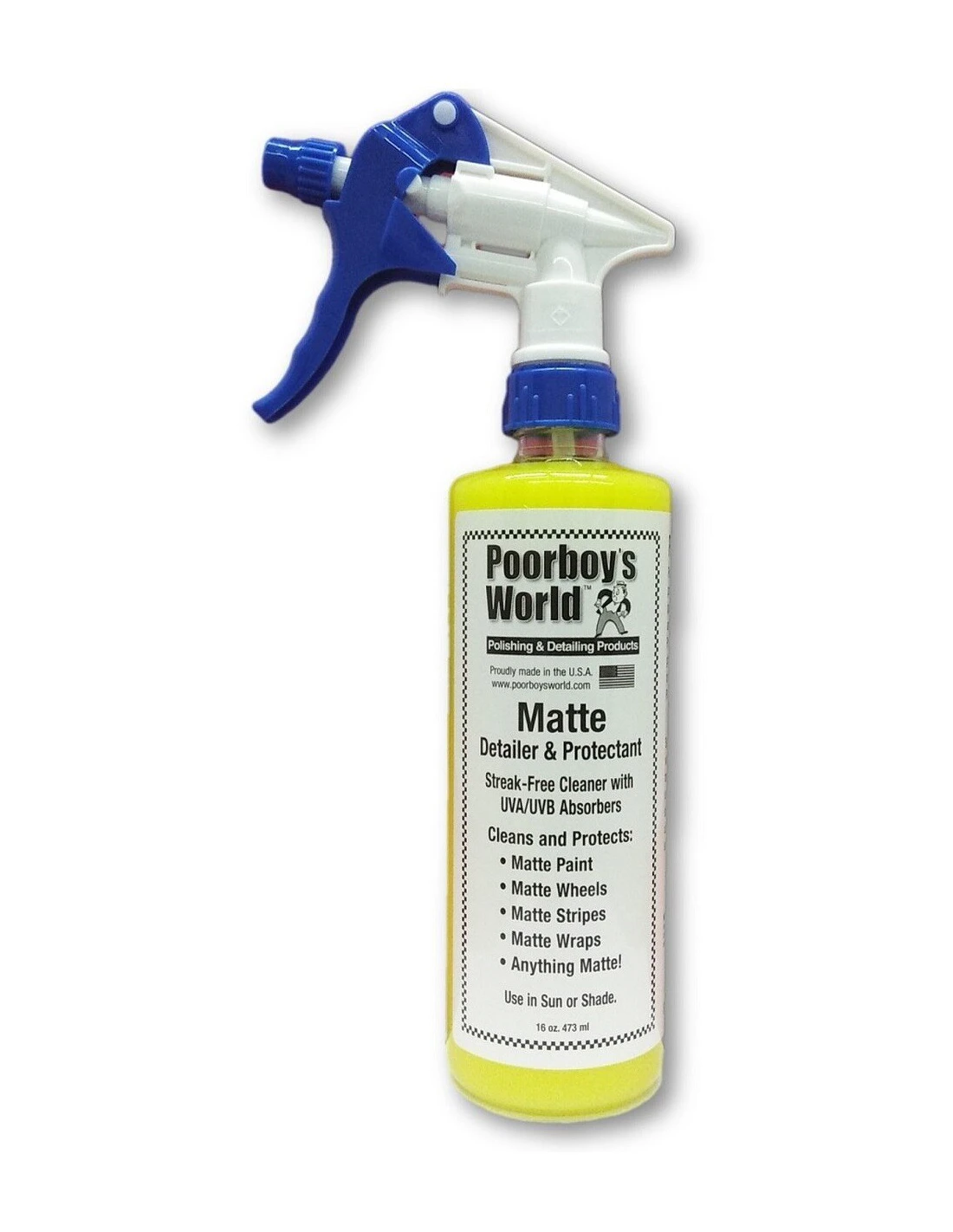 POORBOY'S Matte Cleaner and Protectant to środek przeznaczony do czyszczenia i zabezpieczenia niemal każdej matowej powierzchni. Dedykowany jest zwłaszcza do pielęgnacji samochodów z matowymi lakierami oraz do samochodów, których lakier oklejony jest matową folią. Doskonale sprawdza się przy pielęgnacji matowych felg, elementów plastikowych I winylowych. Matte Detailer & Protectant jest prosty w użyciu, nie nadaje połysku matowym powierzchniom i stanowi skuteczną ochronę przed promieniowaniem UV.