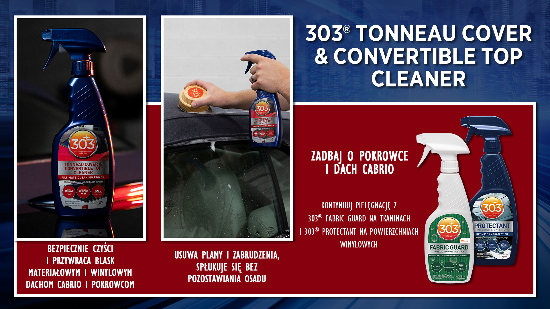 303 Tonneau Cover & Convertible Top Cleaner to płyn przeznaczony do czyszczenia i odplamiania miękkich dachów cabrio. Doskonale czyści zarówno powierzchnie winylowe jak i materiałowe . Dzięki właściwościom koloidalnym usuwa z materiału najcięższe zabrudzenia. Bezpieczny dla każdego rodzaju materiałów z których produkuje się miękkie dachy cabrio. Dodatkowo idealnie nadaje się do czyszczenia tapicerki samochodowej. 303 Tonneau Cover & Convertible Top Cleaner jest nietoksyczny i niepalny.