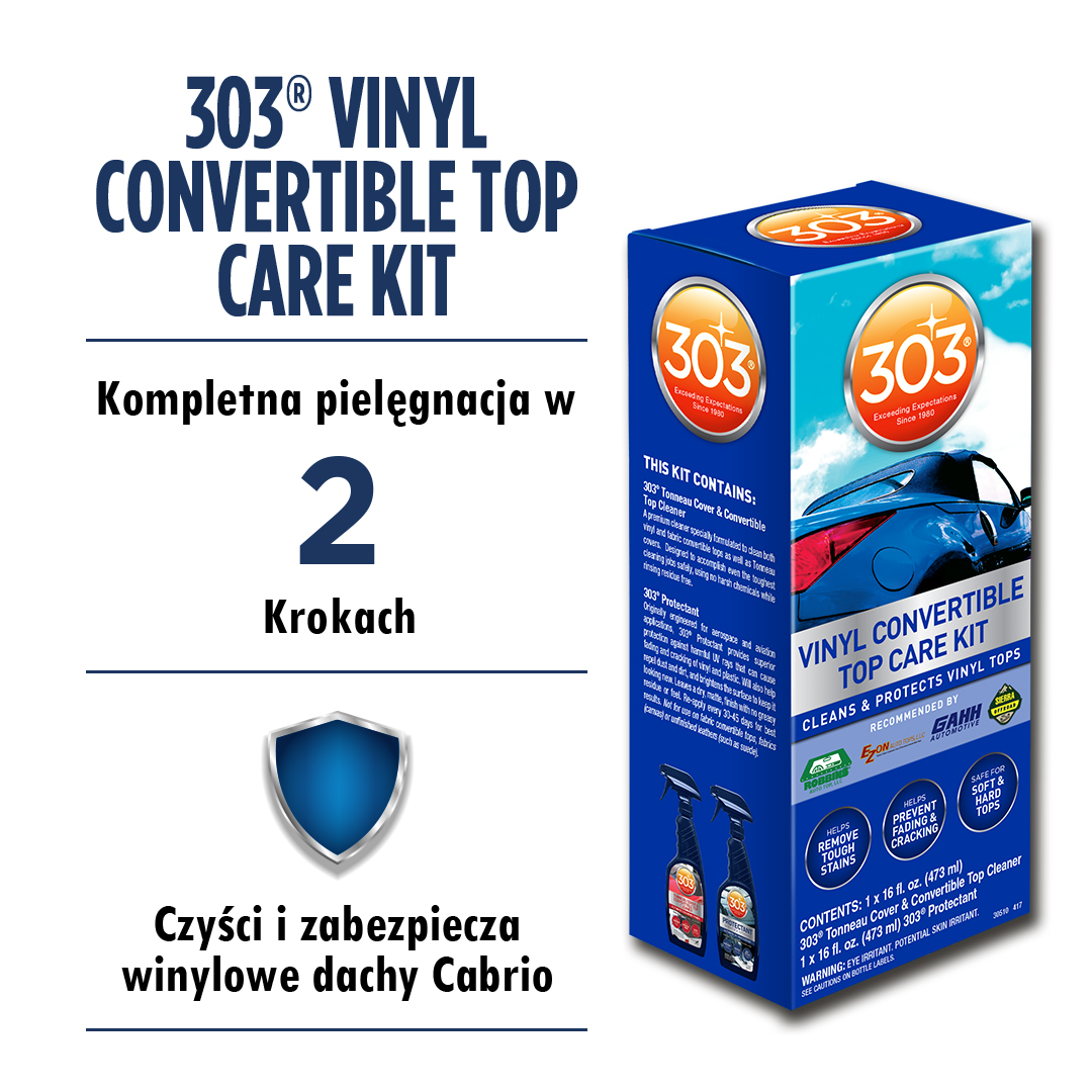 303 Convertible Top Cleaner to płyn przeznaczony do czyszczenia i odplamiania miękkich dachów cabrio. Doskonale czyści zarówno powierzchnie winylowe jak i materiałowe . Dzięki właściwościom koloidalnym usuwa z materiału najcięższe zabrudzenia. Bezpieczny dla każdego rodzaju materiałów z których produktuje się miękkie dachy cabrio. Dodatkowo idealnie nadaje się do czyszczenia tapicerki samochodowej. 303 Convertible Top Cleaner jest nietoksyczny i niepalny.