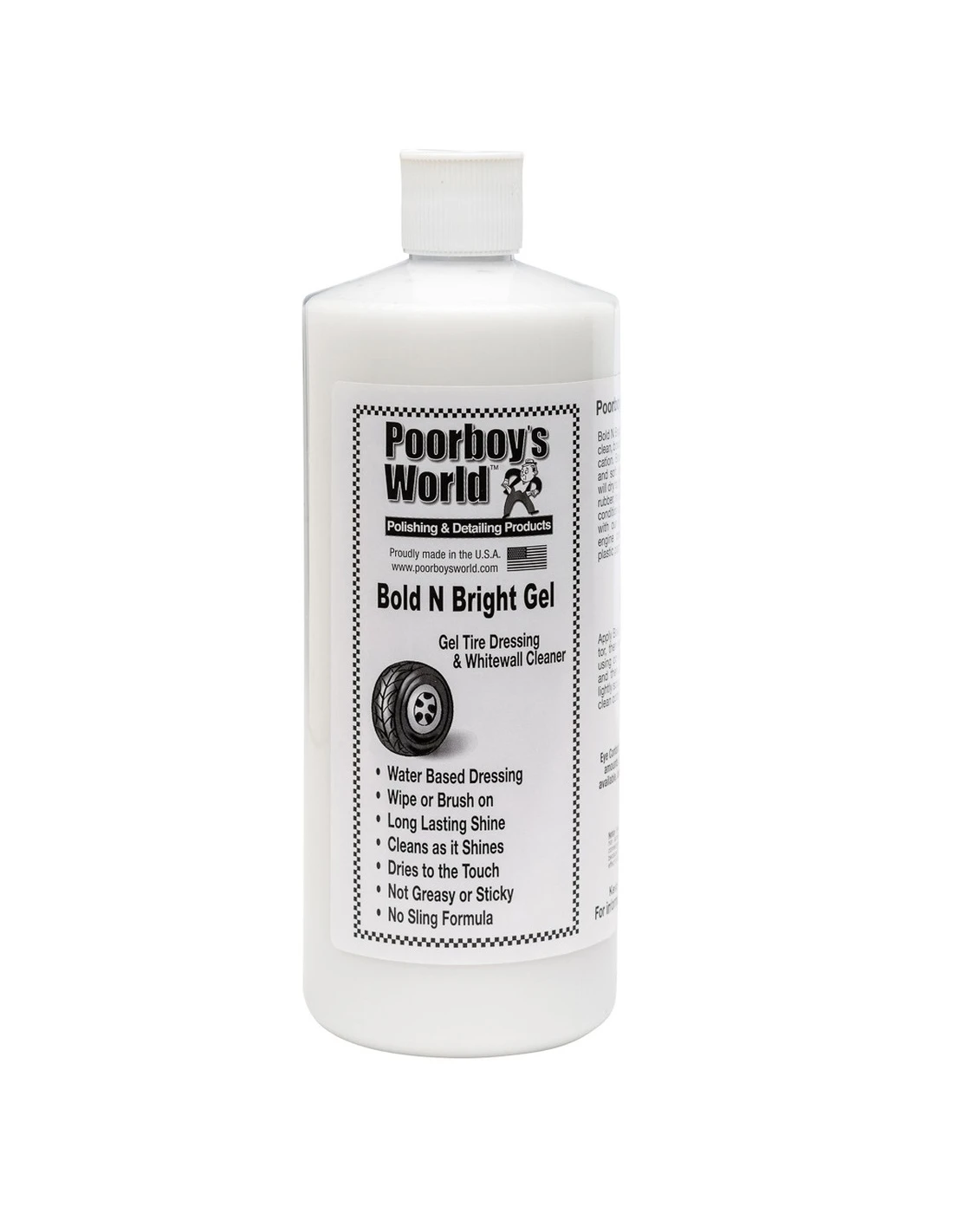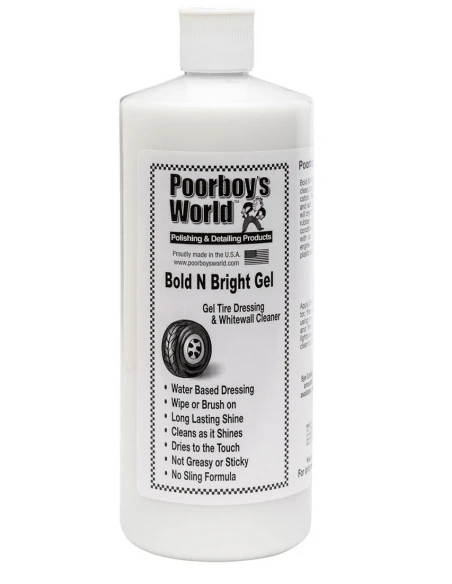 Poorboy’s Bold N Bright Gel jest dressingiem do opon opartym na bazie wody dostarczającym subtelnego, satynowego wykończenia. Posiada żelową konsystencję ułatwiającą aplikację. Jest produktem całkowicie wolnym od rozpuszczalników i substancji ropopochodnych. Stosuj Poorboy’s Bold N Bright Gel dla długotrwałego połysku. Produkt nie pozostawia tłustego i lepkiego filmu.