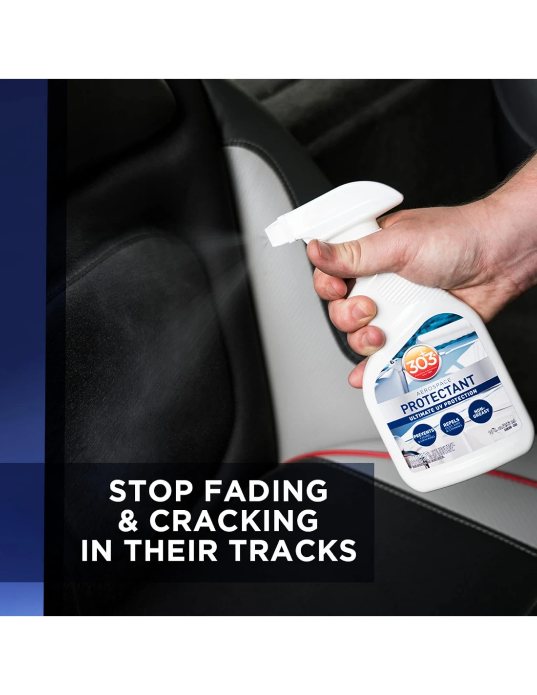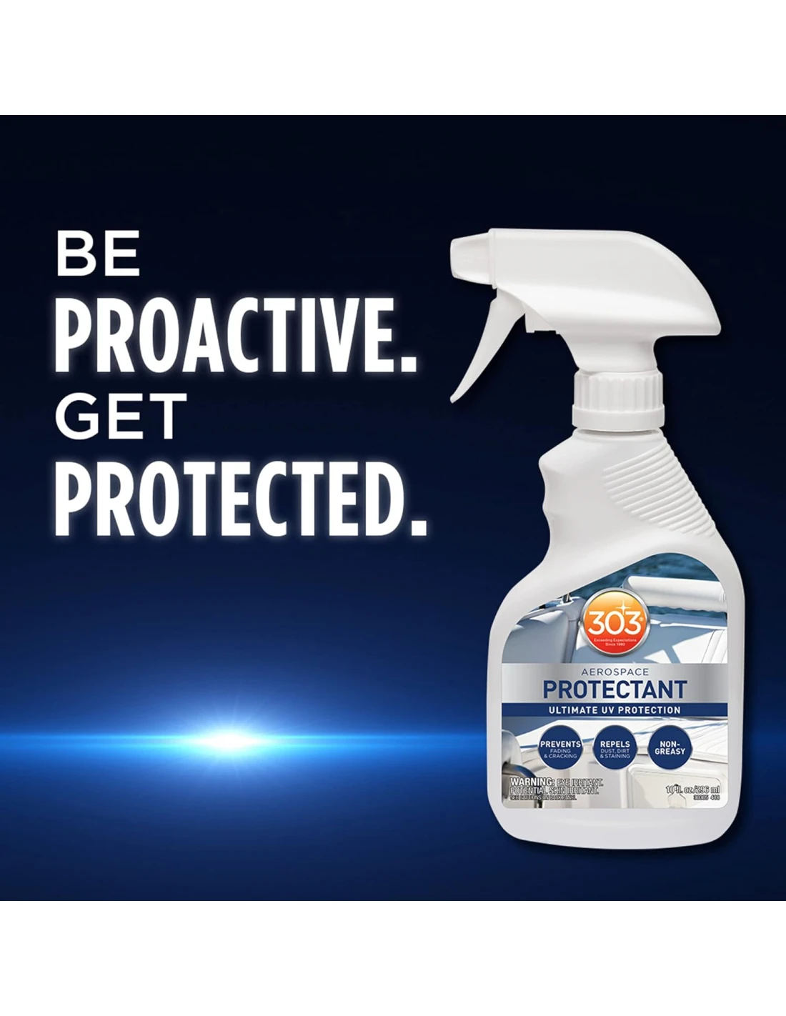 • Dachy bimini łodzi: Chroń swój pokrowiec łodzi przez cały rok przed szkodliwymi promieniami UV (które mogą powodować blaknięcie/pękanie) w miesiącach letnich, a zimą zachowa giętkość materiału i zapobiegnie jego wysychaniu i pękaniu. 303 Aerospace Protectant pomoże również ułatwić usuwanie/szczotkowanie nagromadzonego śniegu i lodu.