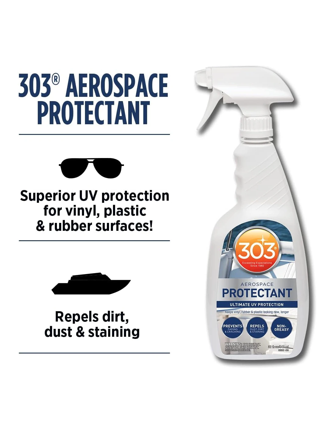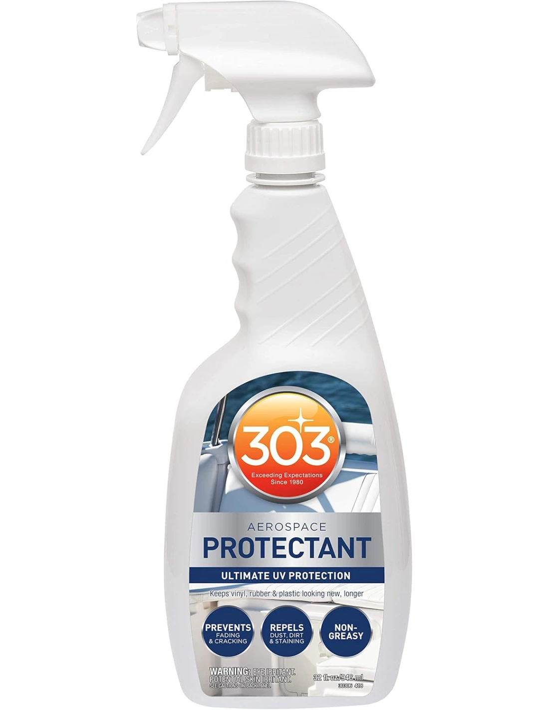 • Dachy bimini łodzi: Chroń swój pokrowiec łodzi przez cały rok przed szkodliwymi promieniami UV (które mogą powodować blaknięcie/pękanie) w miesiącach letnich, a zimą zachowa giętkość materiału i zapobiegnie jego wysychaniu i pękaniu. 303 Aerospace Protectant pomoże również ułatwić usuwanie/szczotkowanie nagromadzonego śniegu i lodu.