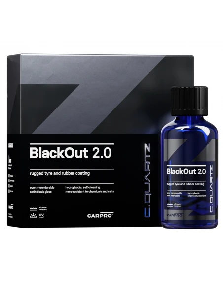 CARPRO BlackOut 2.0 to ulepszona formuła zaawansowanej powłoki ochronna stworzona specjalnie z myślą o oponach oraz zewnętrznych elementach gumowych. Dzięki zastosowaniu technologii opierającej się na bazie wody i cząsteczek SiO₂, produkt zapewnia długotrwałą ochronę przed promieniowaniem UV, chemią, solą drogową i zabrudzeniami, jednocześnie nadając powierzchni eleganckie, czarne satynowe wykończenie.