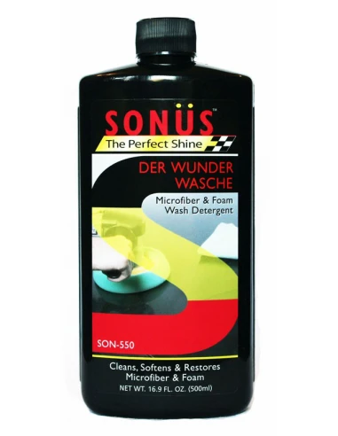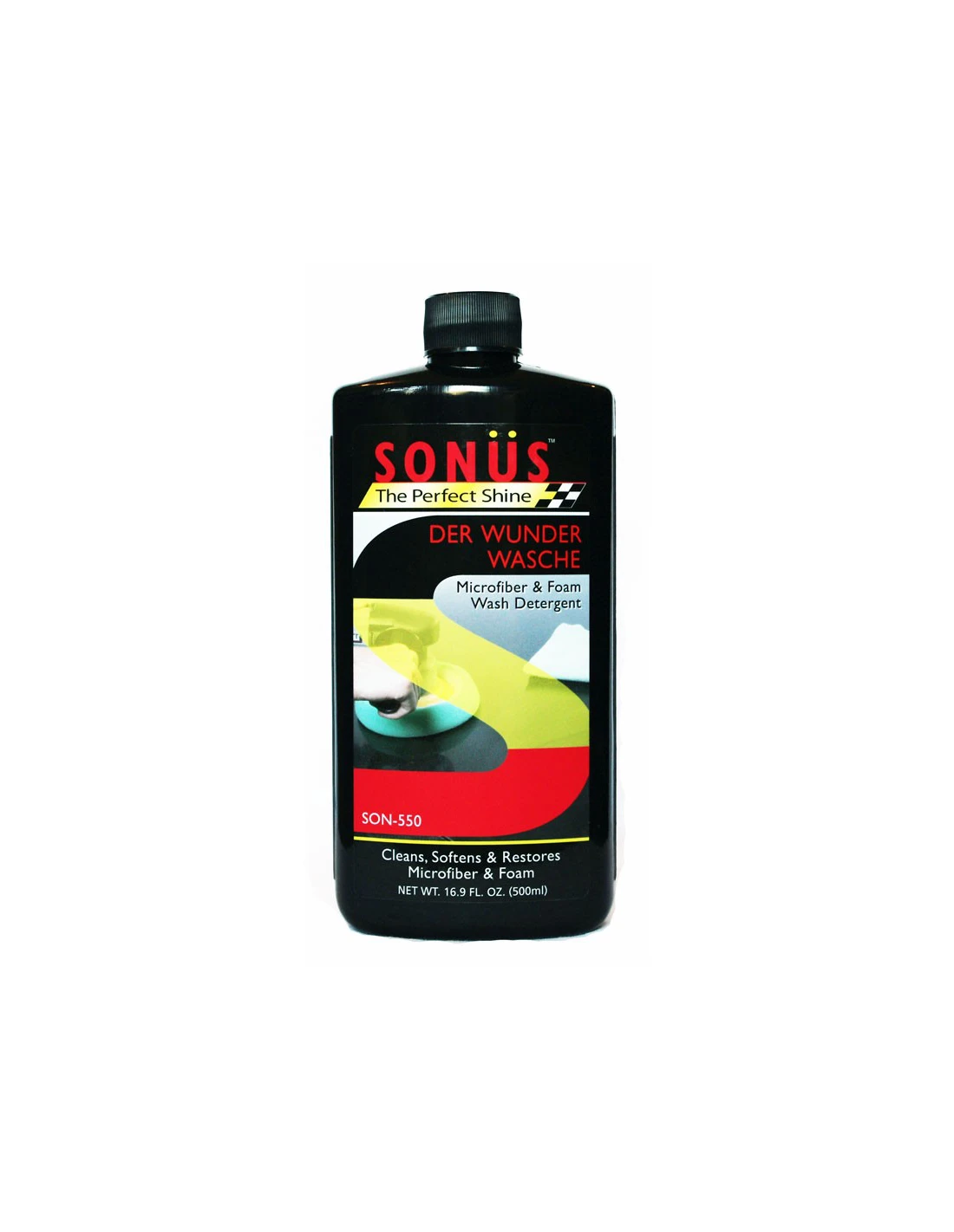 Sonus Der Wunder Wasche - aktywny płyn do prania mikrofibr, rękawic i gąbek do mycia karoserii, gąbek i padów polerskich, aplikatorów. Aktywne mikro-składniki płynu unoszą i rozpuszczają najbardziej oporne zabrudzenia, takie jak woski, pasty polerskie, oleje, smary, sylikony i inne . Zabrudzenia te emulgują z wodą i dają się łatwo wypłukać. Płyn nie zawiera wybielaczy ani środków zmiękczających. Regularnie stosowany, przedłuża żywotność mikrofibr, gąbek i padów polerskich.