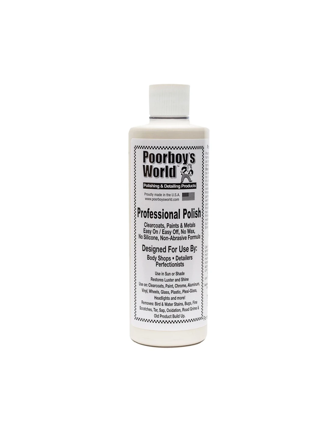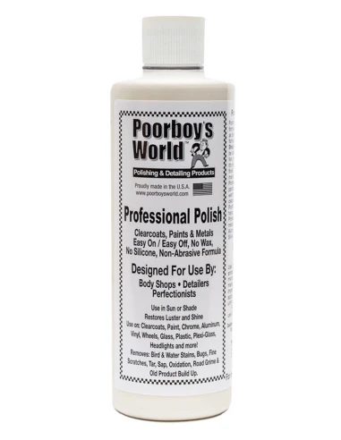 Poorboy’s Proffesional Polish to produkt, który doskonale sprawdza się jako cleaner do powierzchni lakierowanych, metalowych, szyb, plastiku, plexi lub kloszy reflektorów. Nie zawiera sylikonu i wosków. Poorboy’s Proffesional Polish jest idealny jako ostateczny krok w przygotowaniu powierzchni przed nałożeniem wosku lub sealantu. Poorboy’s Proffesional Polish zmniejsza niedoskonałości takie jak mikroryski, plamy z wody, przywraca klarowność wykończenia, przywraca maksimum połysku.