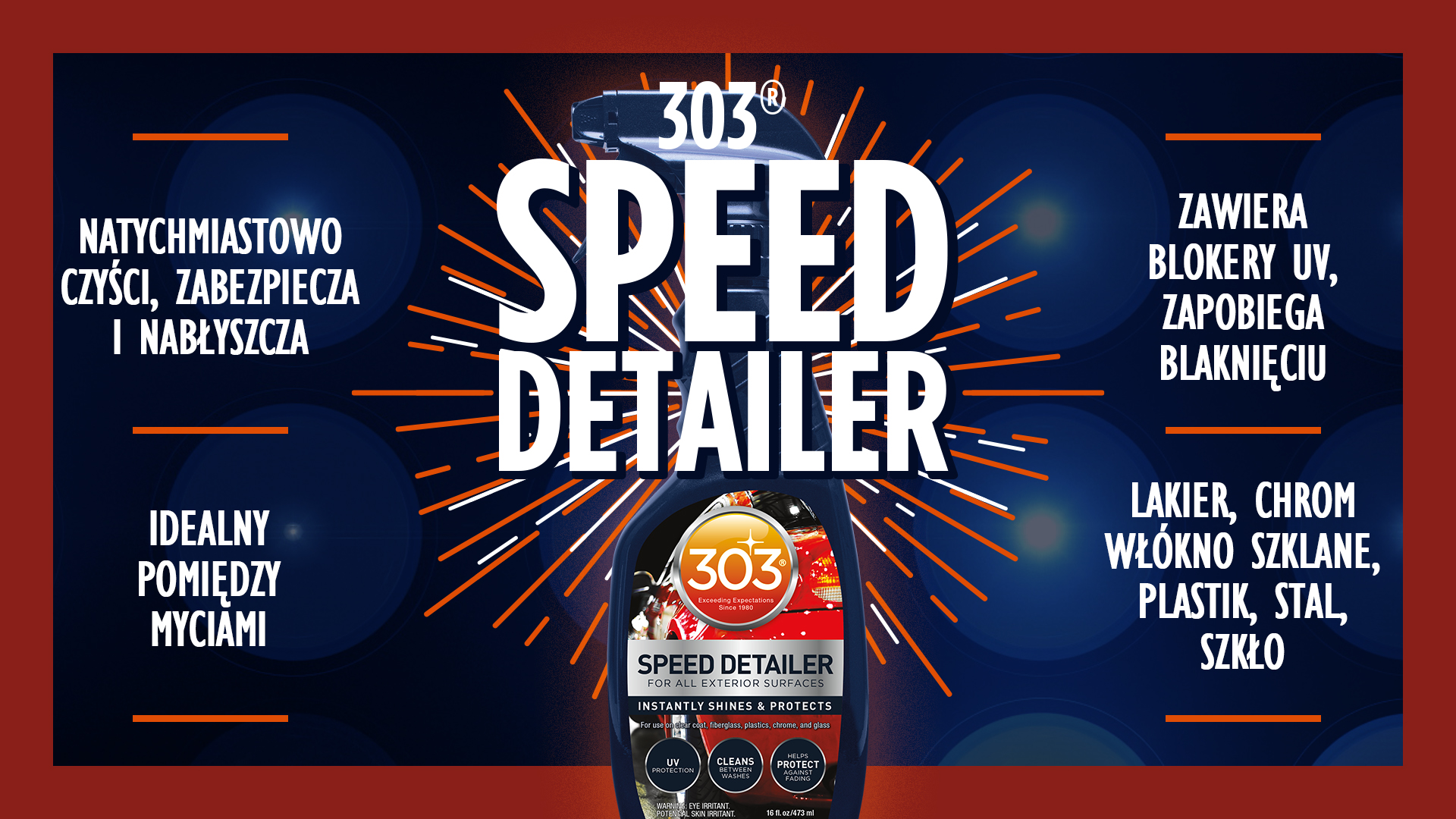 303 Speed Detailer - "quick detailer", płyn który błyskawicznie nadaje połysk lakierowi samochodowemu i elementom metalowym. Usuwa drobne zabrudzenia, kurz, odciski palców, itp. Zapobiega powstawaniu zacieków, działa antystatycznie, dzięki czemu pozwala dłużej utrzymać powierzchnie w czystości. Ponadto rewelacyjnie sprawdza się na powierzchniach takich jak szkło, włókno szklane, pleksi, plastik. Formuła 303 Speed Detailer zawiera filtr przeciwsłoneczny SPF 40, dzięki czemu chroni powierzchnie przed blaknięciem. Regularne stosowanie ogranicza ryzyko utleniania się lakieru spowodowane czynnikami atmosferycznymi.