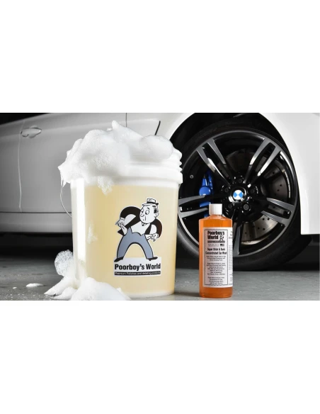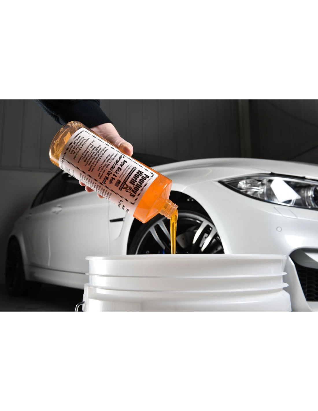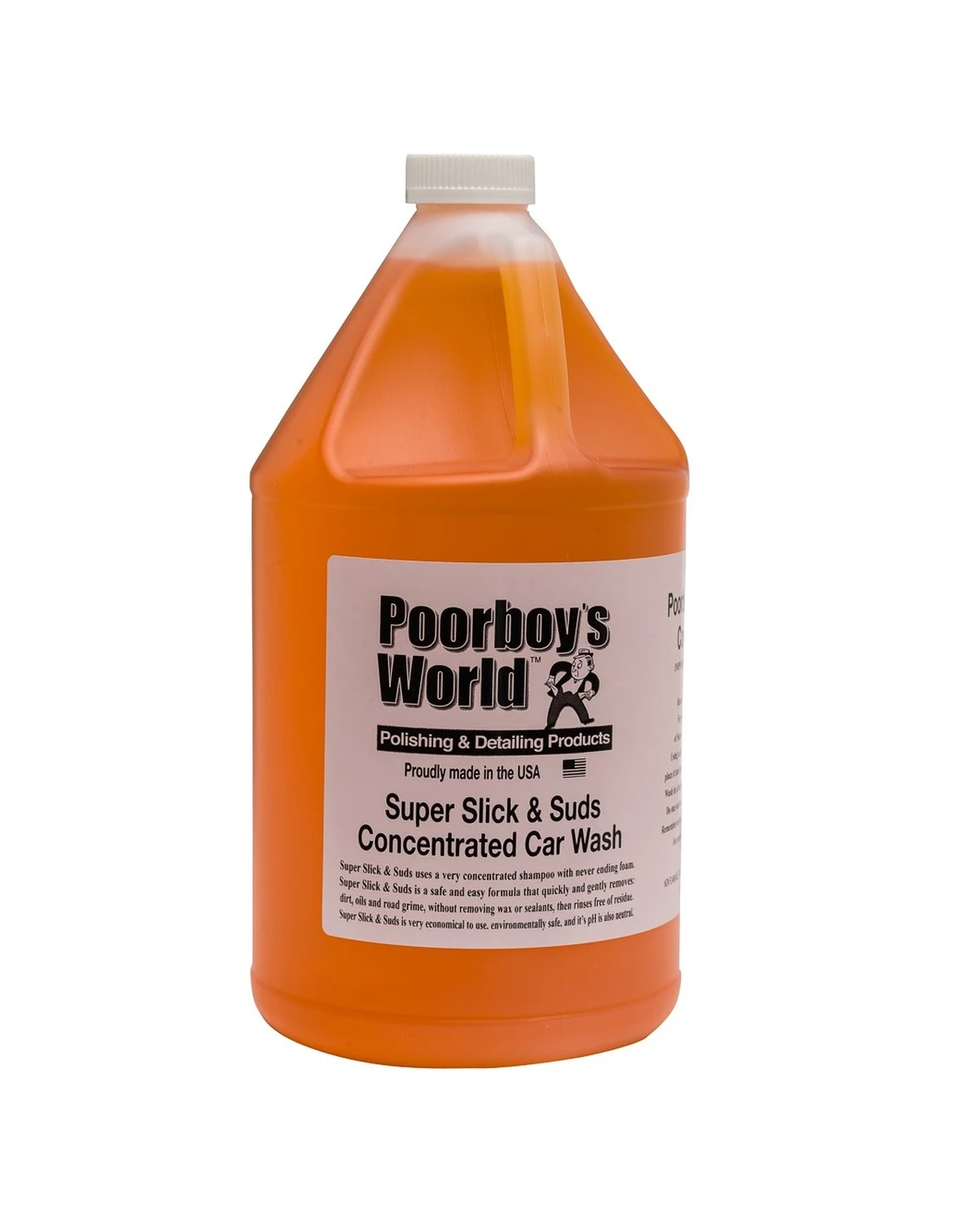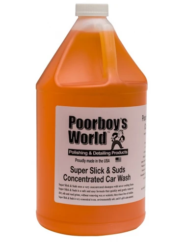 Poorboy’s Super Slick & Suds to delikatny, nietoksyczny, biodegradowalny, skoncentrowany szampon samochodowy o neutralnym pH. Jest wysoce skuteczny w usuwaniu brudu ulicznego i innych nieczystości. Nowoczesna technologia szamponu jest połączeniem naturalnych składników czyszczących i olejków nawilżających, które „zamykają” cząsteczki brudu i unoszą je ponad powierzchnię lakieru. Receptura ta ogranicza możliwość zarysowań lakieru w procesie mycia, pozwala wytworzyć obfitą pianę. Jest efektywna, lecz zarazem delikatna dla każdego rodzaju powierzchni zewnętrznych Twojego samochodu, nie niszczy istniejącej powłoki ochronnej w postaci sealantu lub wosku naturalnego.