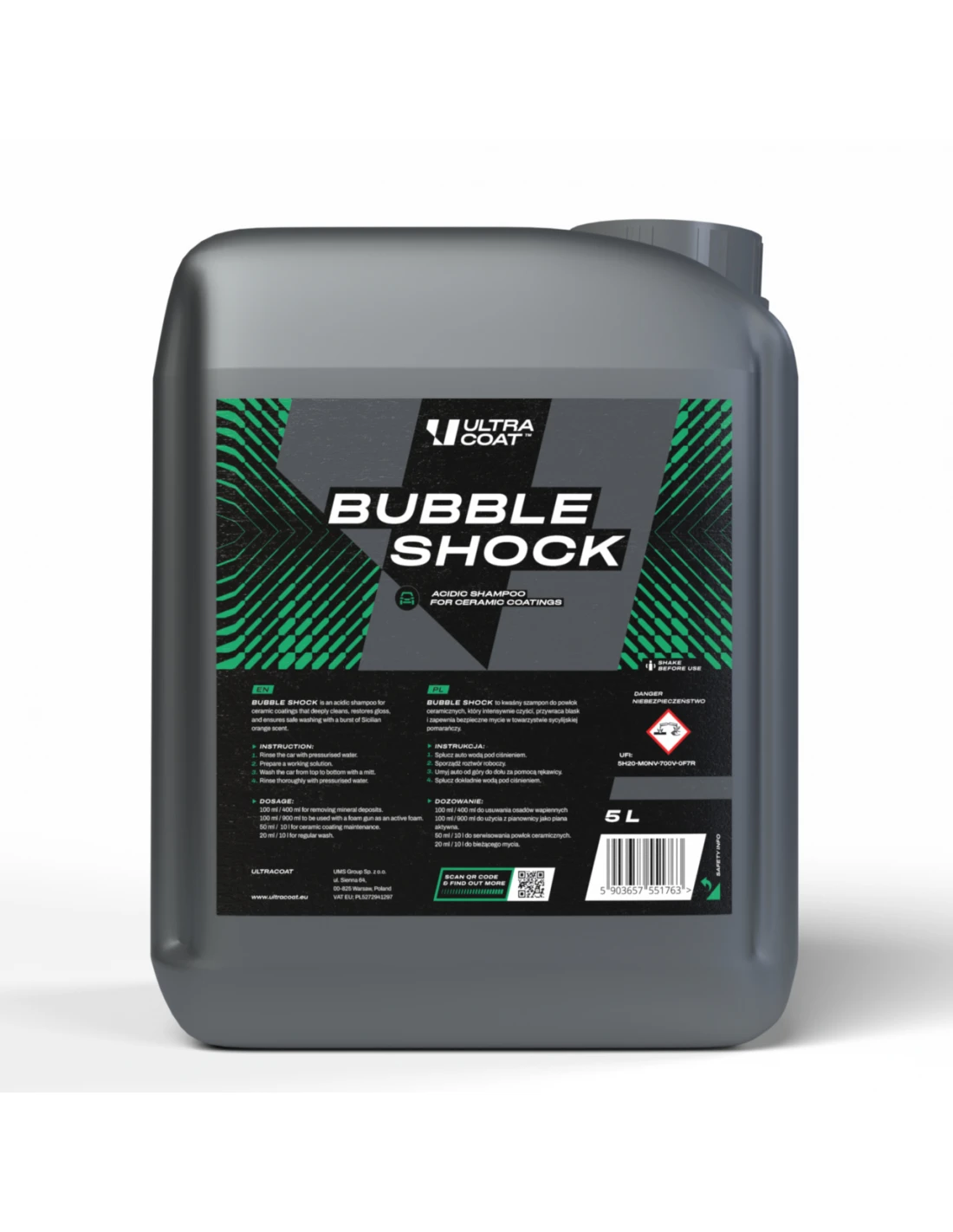 Moc produktu została zbalansowana tak, aby zachować bezpieczeństwo dla powłok ceramicznych, a jednocześnie znacząco usprawnić usuwanie osadów mineralnych z powierzchni. Bubble Shock w wysokim stężeniu może być również stosowany jako produkt typu - Water Spot Remover.