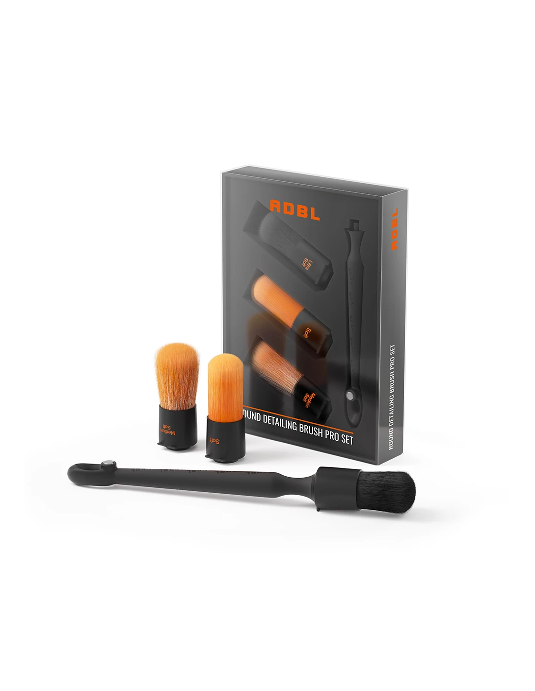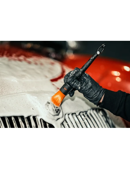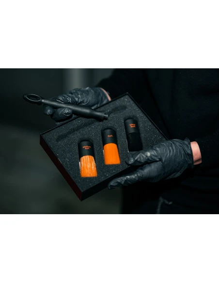 Zestaw zawierający trzy wymienne końcówki pędzla o różnych stopniach miękkości oraz odkręcaną rączkę. Przeznaczony jest do czyszczenia detali, szczelin lub trudniejszych do usunięcia zabrudzeń znajdujących się na delikatnych powierzchniach. W każdej końcówce włosie jest gęsto nabite, bardzo wytrzymałe, odporne na działanie chemii, jego końcówki są odporne na degradację. Wypustki na końcówkach zapobiegają spadaniu z pochyłej powierzchni. Uniwersalna rączka wykonana z wysokiej jakości tworzywa sztucznego, powleczona jest antypoślizgową warstwą gumy, dodatkowo wyposażona została w magnes umożliwiający przytwierdzenie do metalowej powierzchni. Dzięki kompaktowym gabarytom i praktycznemu opakowaniu zestaw jest idealny do pracy w studiu detailingowym lub jako praktyczny gadżet w aucie.