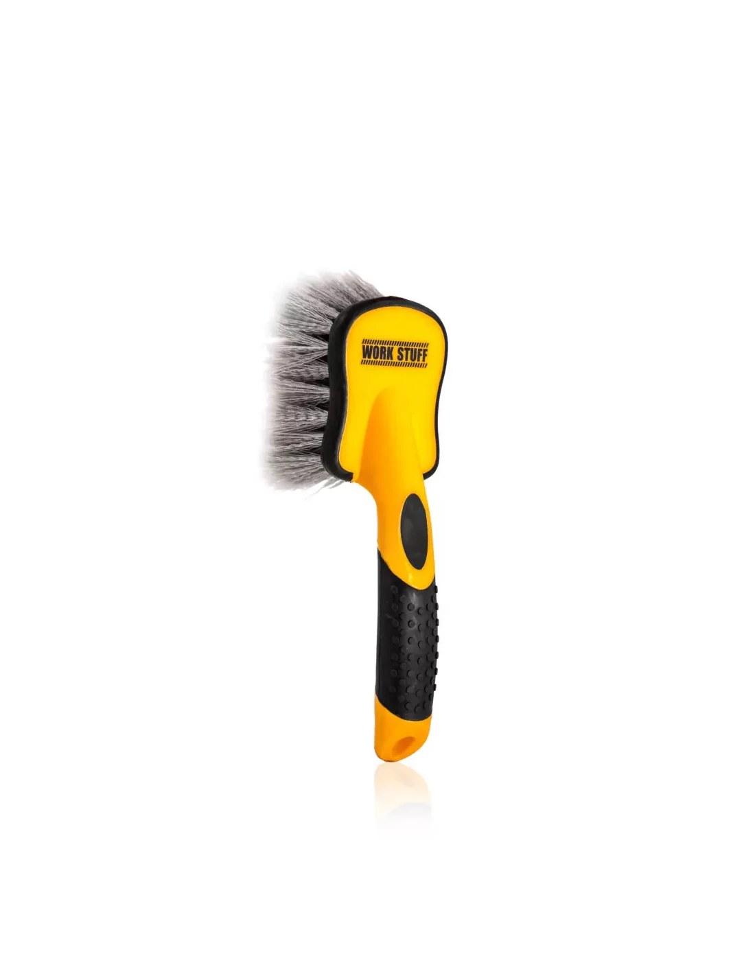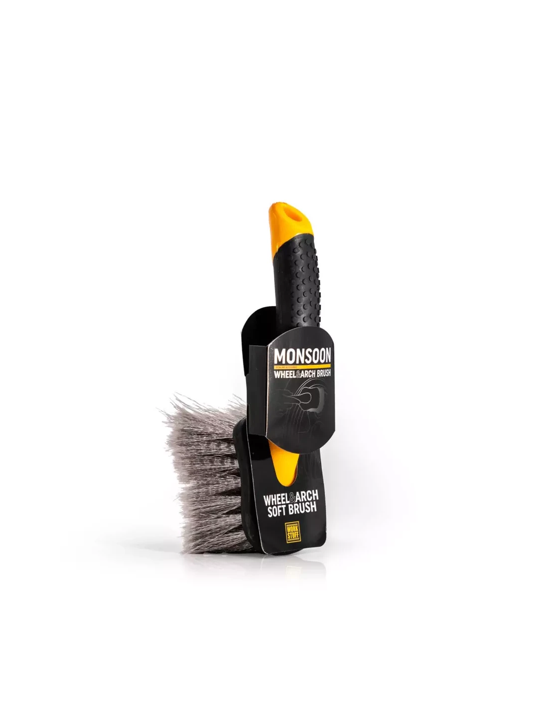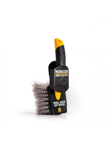 MONSOON to uniwersalna szczotka do kompleksowego mycia kół: felg, opon, nadkoli. Na wydajność i trwałość opon ma wpływ ich regularne czyszczenie, usuwanie kamieni, piasku i innych zanieczyszczeń jest więc kluczowe. Szczotka poradzi sobie również z uporczywym brudem, kurzem i osadem hamulcowym z felg aluminiowych i chromowanych. Dobrze spienia produkty czyszczące a jednocześnie jest odporna nawet na ciężką chemię. Średnio twarde włosie, lekko pofalowane i elastyczne posiada rozdwojone końcówki przez co jest na tyle delikatna, że nie spowoduje zarysowań i uszkodzeń. Nawet przy intensywnym szorowaniu włókna zachowują kształt i efektywność nawet po wielokrotnym użyciu, nie wygina się i nie gubi włosia. Monsoon nie posiada ostrych krawędzi, a plastikowe elementy osłonięte są gumą, więc nawet przypadkowo nie zarysujesz powierzchni. Na uwagę zasługują jej optymalne wymiary, jest kompaktowa, lekka i bardzo poręczna. Rękojeść pokryliśmy wypustkami i antypoślizgową, gumową powłoką, dzięki czemu nie wyślizgnie ci się z ręki nawet po zamoczeniu. Pamiętaj, aby po skończonej pracy opłukać szczotkę i pozostawić ją do wyschnięcia, możesz ją powiesić na haczyku co ułatwi ci otwór na końcu rękojeści .