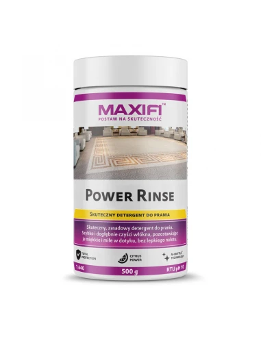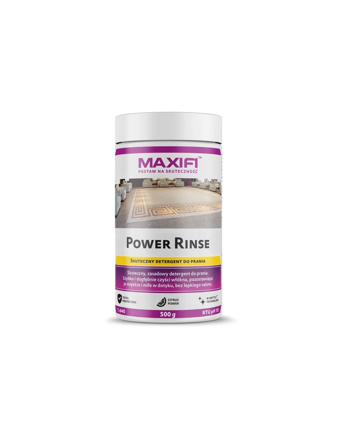 Maxifi Power Rinse jest ultra-skoncentrowanym detergentem do ekstrakcji o wysokiej zawartości substancji aktywnych. Wyprzedza konkurencyjne produkty w testach i jest ekonomiczny w użyciu. Power Rinse zawiera unikalną kompozycję składników, które szybko rozkładają i rozpuszczają najcięższe zabrudzenia, a technologia M-BRITTLE™ nadaje włóknom miłej w dotyku miękkości i zabezpiecza je przed szybszym brudzeniem się. Power Rinse został wzbogacony naturalnym rozpuszczalnikiem CITRUS POWER, aby jeszcze skuteczniej usuwać tłuste zabrudzenia. Dzięki formule TOTAL PROTECTION Twój sprzęt jest chroniony przed korozją oraz powstawaniem osadów.