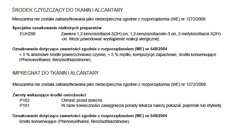 Użycie: Wszystkie produkty należy najpierw sprawdzić w niewidocznym miejscu. Na czysta i sucha powierzchnię należy nanieść cienką i równomierną warstwę impregnatu z odległości około 40 cm. Następnie należy pozostawić impregnat do wyschnięcia. Powierzchnie narażone na mocne zużycie należy po wyschnięciu spryskać ponownie. Po czyszczeniu czy praniu należy ponownie zaimpregnować powierzchnię. Środek należy stosować zgodnie z instrukcją zawarta na opakowaniu. Należy bezwzględnie przestrzegać zaleceń bezpieczeństwa zawartych na etykiecie.
