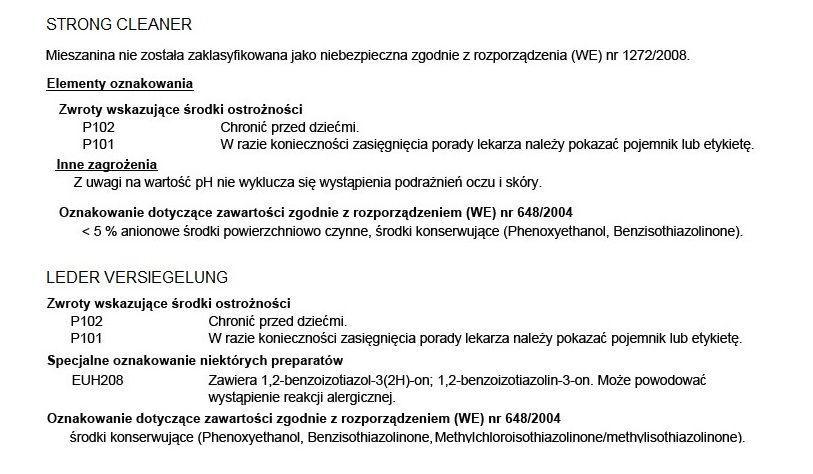 Zawartość: 200ml środka Strong Cleaner jest to wystarczająca ilość do 3 krotnego wyczyszczenia kompletu foteli samochodowych. Środek znajduje się w butelce z aplikatorem piany. Usuwa trudne zabrudzenia, nie uszkadza struktury skóry, nie usuwa farby z jej powierzchni. Dodatkowo niweluje nieprzyjemne zapachy typu pot, dym papierosowy itp. Leder Versiegelung jest to środek ochronny do skór gładkich, które są szczególnie narażone na wycieranie. Dzięki zastosowaniu technologi polimerowej tworzy niewidoczną warstwę ochronną, która chroni farbę i zapobiega jej ścieraniu.