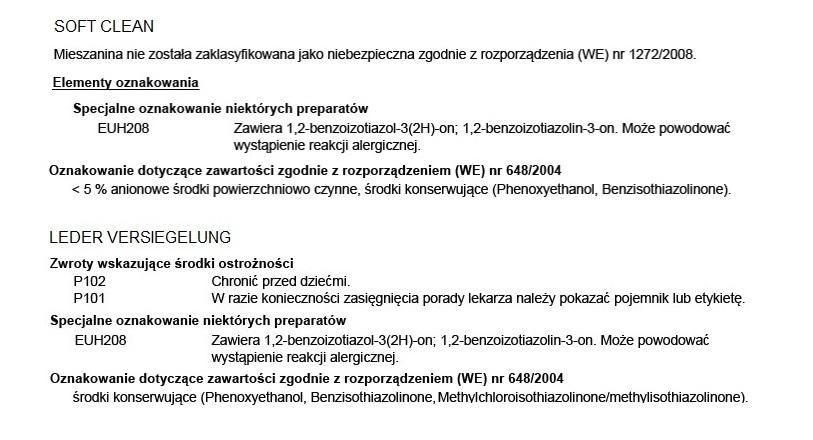 Zawartość: 200ml środka Soft Clean jest to wystarczająca ilość do 3 krotnego wyczyszczenia kompletu foteli samochodowych. Środek znajduje się w butelce z aplikatorem piany. Usuwa trudne zabrudzenia, nie uszkadza struktury skóry, nie usuwa farby z jej powierzchni. Dodatkowo niweluje nieprzyjemne zapachy typu pot, dym papierosowy itp. Leder Versiegelung jest to środek ochronny do skór gładkich, które są szczególnie narażone na wycieranie. Dzięki zastosowaniu technologi polimerowej tworzy niewidoczną warstwę ochronną, która chroni farbę i zapobiega jej ścieraniu.