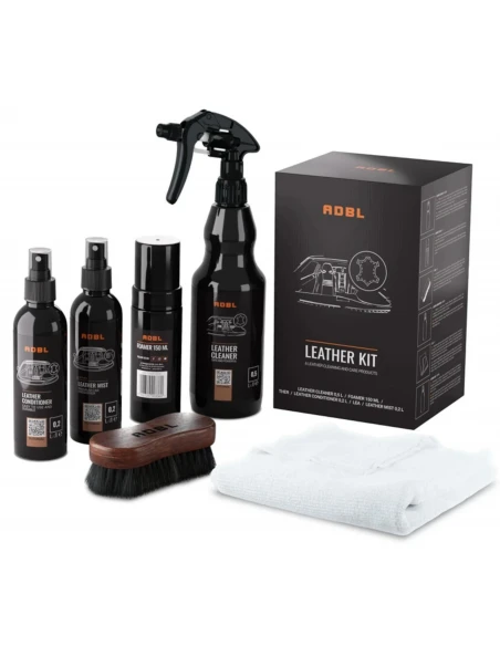 Leather Kit to zestaw 6 produktów, które pomogą Ci zadbać o Twoją skórzaną tapicerkę. Zawiera Leather Cleaner oraz Conditioner. Jeżeli chcesz nakładać Cleaner’a jako pianę, to dołączyliśmy też pianowniczkę o pojemności 150 ml. Zestaw zawiera również Lea i Ther – mikfrofibrę oraz szczotkę, aby pomóc Ci odpowiednio nałożyć te produkty na tapicerkę. Po skończonej pracy możesz użyć dołączonego Leather Mist, aby wypełnić wnętrze swojego samochodu świetnym skórzanym zapachem!
