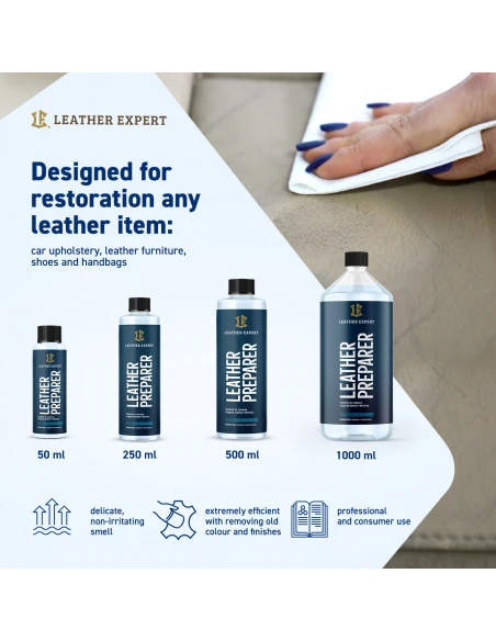 Leather Preparer znajduje zastosowanie w renowacji różnego rodzaju skór, obuwia, galanterii i torebkach a także w samochodach i meblach skórzanych. Używać do skóry naturalnej. Nie stosować do ekoskóry, zamszu i nubuku.