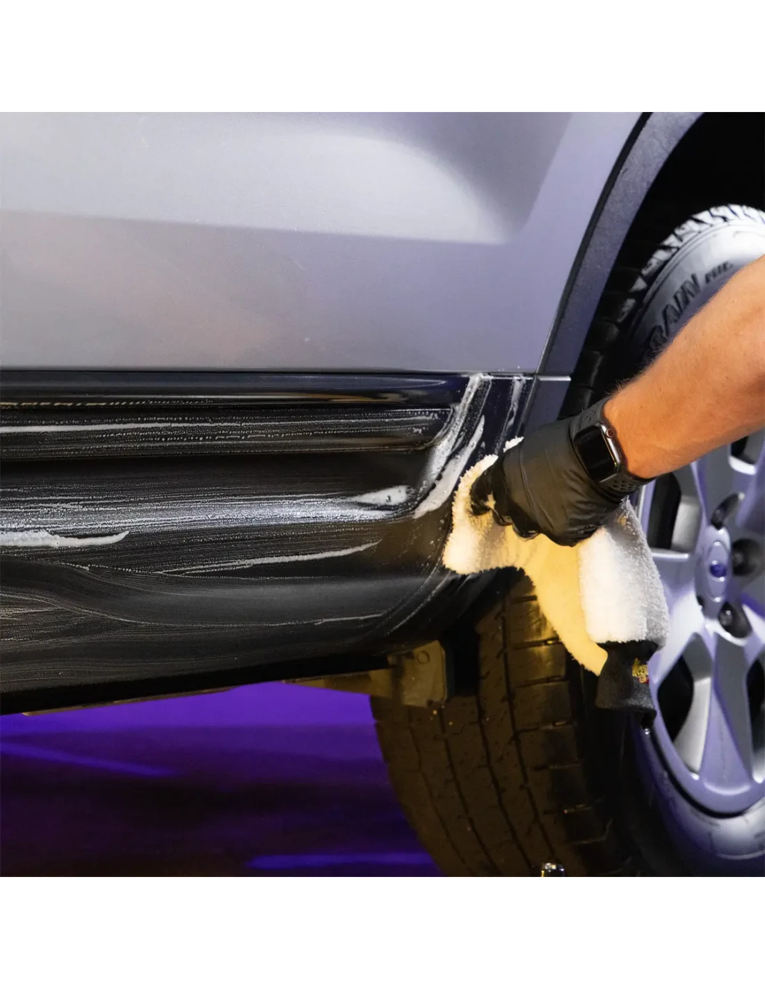 Pierwszym krokiem jest użycie środka czyszczącego do usunięcia zanieczyszczeń i oznak utleniania oraz dokładne oczyszczenie czarnych i szarych listew wykończeniowych. To pozwala zmaksymalizować trwałość i wiązanie ochronnej powłoki Protective Trim Shield. Następnie aplikujemy Protective Trim Shield, który odnawia wygląd plastikowych elementów i tworzy bardzo trwałą warstwę ochronną. Produkt blokuje szkodliwe promieniowanie UV i – według testów laboratoryjnych – utrzymuje się przez ponad 250 myć samochodu. W zestawie znajduje się również wygodny aplikator, który umożliwia równomierne nałożenie preparatu, zapewniając idealne krycie i estetyczny efekt.