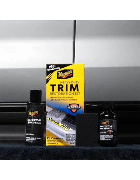Ten trzyczęściowy zestaw zawiera: środek czyszczący, powłokę ochronną Trim Shield oraz aplikator. Dzięki niemu z łatwością przywrócisz świetny wygląd wyblakłym elementom i zapewnisz im długotrwałą ochronę, nadając głębię oraz intensywny kolor – w zaledwie dwóch prostych krokach.