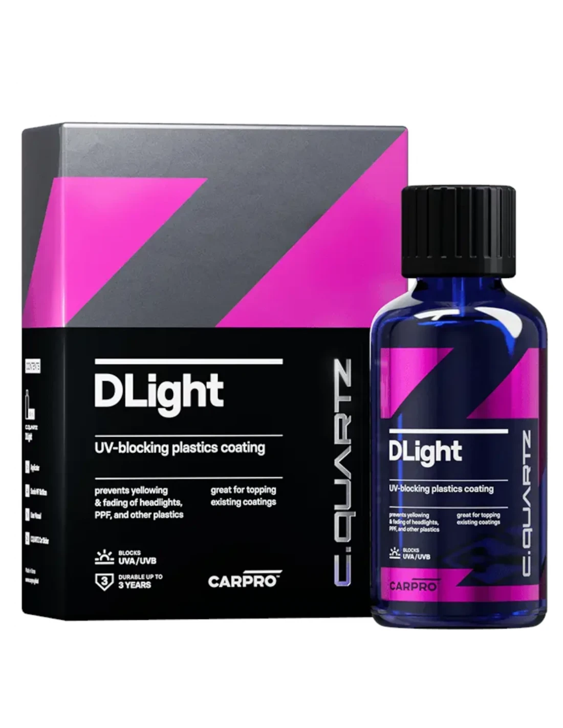 Zastosowanie: CarPro DLight może być stosowany na reflektorach, foliach ochronnych (PPF) oraz innych plastikowych powierzchniach samochodowych. Może być również używany jako powłoka nawierzchniowa dla innych powłok, gdzie wymagana jest dodatkowa ochrona UV.
