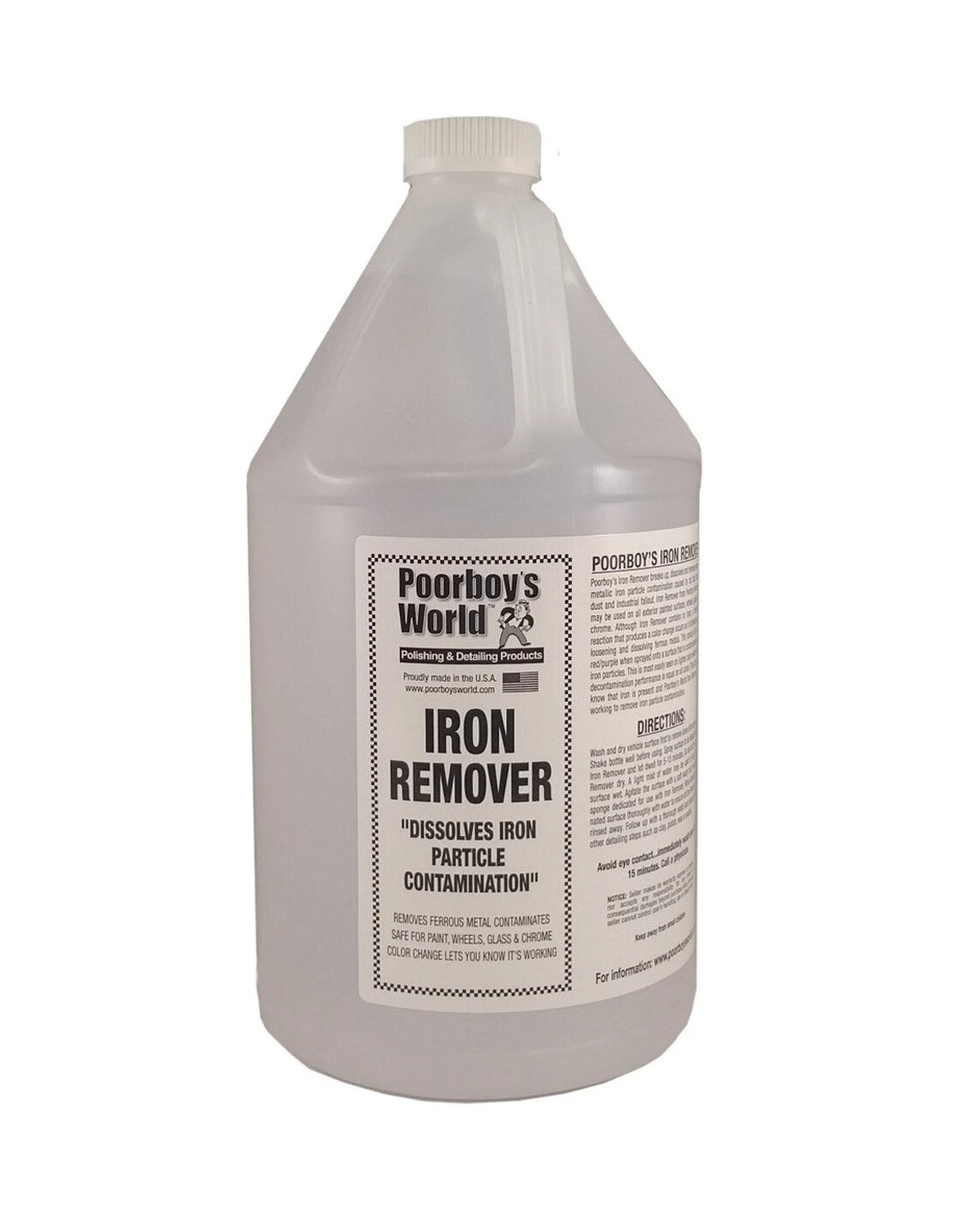 Poorboy’s Iron Remover rozbija, rozpuszcza i usuwa metaliczne drobinki które wbijają się w lakier podczas eksploatacji pojazdu. Środek jest bezpieczny do użycia na wszystkich lakierowanych zewnętrznych elementach pojazdu a także na plastiku i chromie. Pomimo tego, że Iron Remover nie zawiera barwników, chemiczna reakcja powoduje zmianę koloru środka na czerwony kiedy zaczyna on działać na zanieczyszczonej powierzchni.