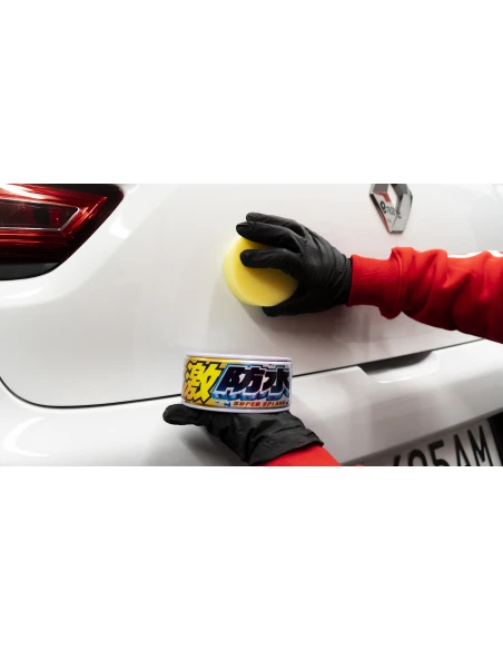 - Zaaplikuj wosk na dołączoną gąbkę poprzez lekkie wcieranie jej w wosk po otwarciu puszki.