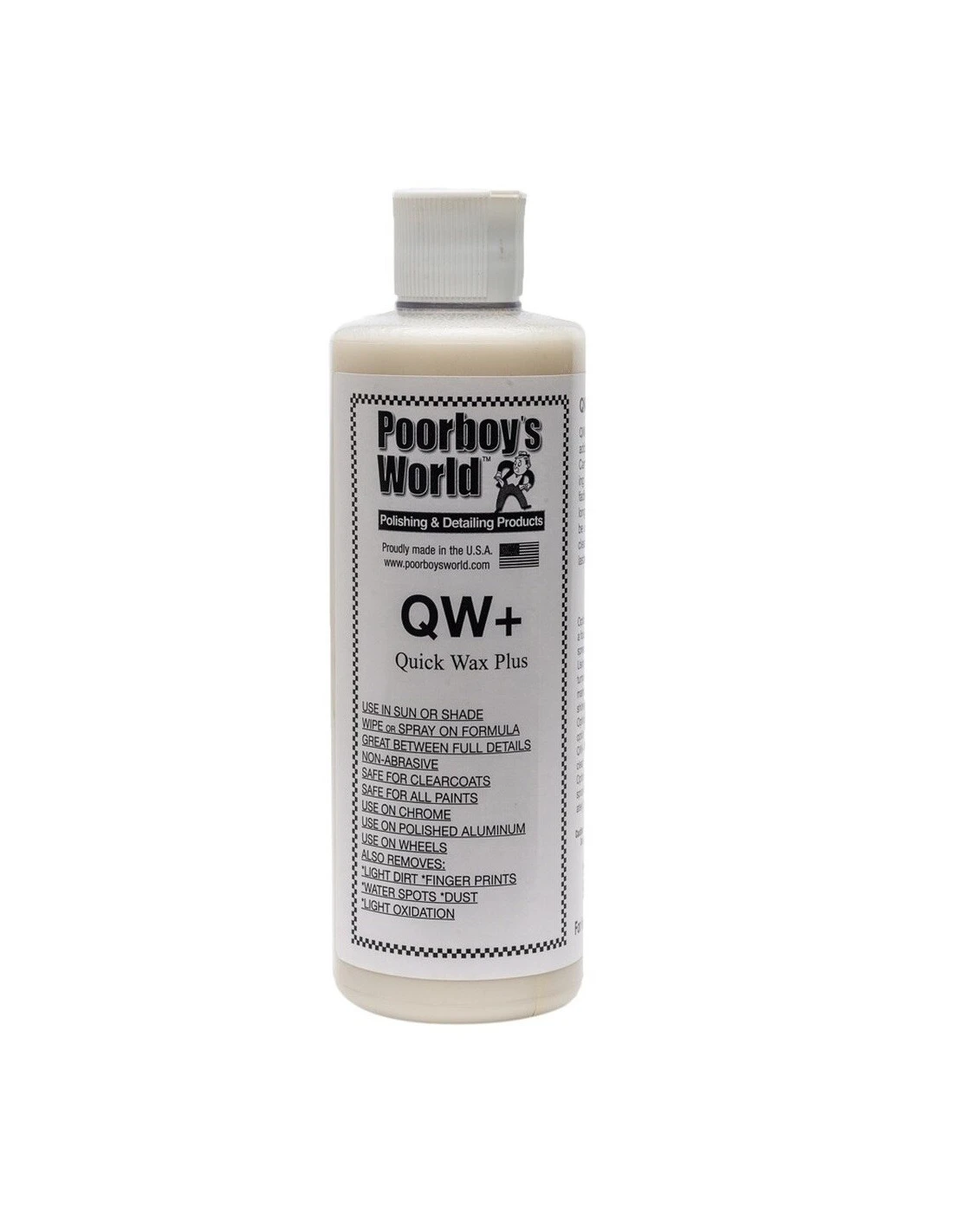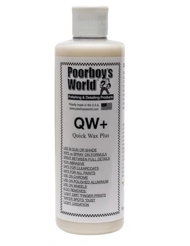 POORBOY’S Quick Wax Plus (QW+) to przysłowiowa wisienka na torcie w postaci dodatkowej porcji blasku dla każdego zadbanego automobilu. Produkt ten łączy cechy quick detailera oraz wosku płynnego. Pozwala nie tylko odświeżyć delikatnie przykurzony lakier ale także uzupełnia warstwę Carnauby i blokerów UV, przez co wydłuża ochronne właściwości wosków. Może być używany na każdej zewnętrznej powierzchni samochodu, zarówno w cieniu jak i na słońcu.